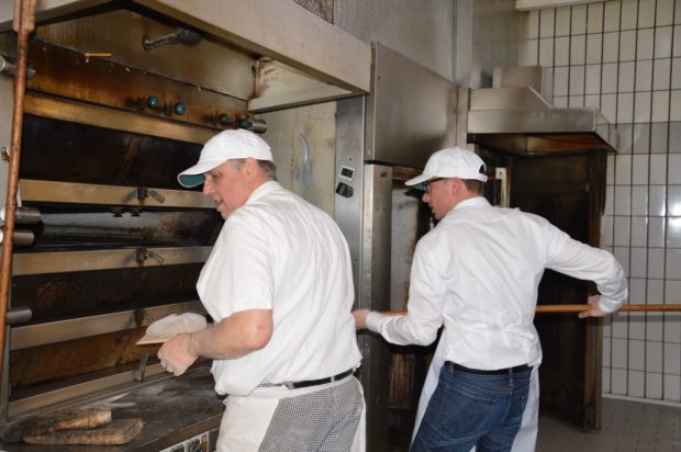 „Unverzichtbar für die Herstellung regionaler Qualitätsprodukte, sind die Rohstoffe, die uns besonders am Herzen liegen. Ich kann zu jedem meiner Produkte eine Geschichte erzählen, da ich alle Lieferanten persönlich kenne. Unser Mehl beziehen wir etwa von der Hehrmühle aus Schlitz, die wie wir Mitglied bei der MGH Gutes aus Hessen ist und Getreide aus kontrolliertem, integrierten Anbau aus Hessen verarbeitet“, erklärte Joachim Haas. Von der Qualität der Rohstoffe, dem notwendigen handwerklichen Geschick in der Verarbeitung und dem überzeugenden Endergebnis konnten sich die Vertreter des SPD Arbeitskreises Landwirtschaft anschließend beim gemeinsamen Brotbacken selbst ein Bild machen: Aus Natursauerteig formten die SPD-Politiker unter Anleitung von Joachim Haas Bierbrote, die unter tatkräftiger Mithilfe von Landtagskandidat Swen Bastian und dem Arbeitskreisvorsitzenden Joachim Diesner in den aufgeheizten Backofen geschoben wurden.