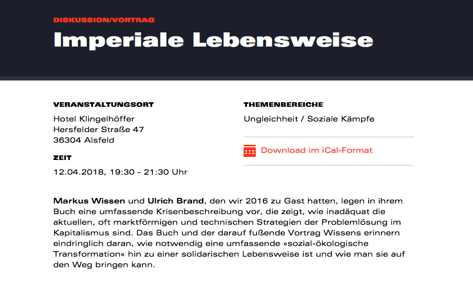 Laut Pressemitteilung berichten er in dem Buch über die Ausbeutung von Mensch und Natur in Zeiten des globalen Kapitalismus und die Notwendigkeit einer umfassenden Umkehr. Verbunden damit stellten sich Fragen: Warum fahren Menschen mit hohem Umweltbewusstsein SUV? Warum fliegen Grünen-WählerInnen häufiger als die Anhänger anderer Parteien? Warum bewegt sich gesellschaftlich und politisch trotz eines zunehmenden Wissens um die ökologische Krise so wenig? „Spannende Fragen, auf die Markus Wissen Antworten gefunden hat, die er mit uns teilen und diskutieren wird“, sagte Schnell.