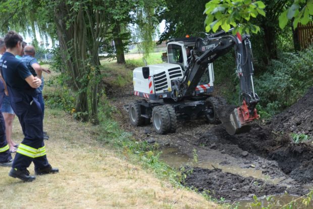 Mit dem Schaufelgerät wurde im Bachbett eine Grube ausgehoben, so konnten die Fische aus dem einlaufenden Wasser abgefischt werden. Wie die Feuerwehr informierte, wurden die geretteten Fische andernorts waidgerecht ausgewildert.