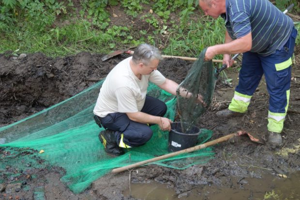„Besorgte Bürger informierten die Gemeindeverwaltung über eine Gefahr für die Fischbrut, in der Folge wurden der Bauhof sowie die Feuerwehr zur Hilfe geschickt“, sagte ein Feuerwehrsprecher. In Zusammenarbeit schmiedeten die Bauhofarbeiter und Feuerwehrleute einen Rettungsplan für die Fische, dazu musste unter anderem ein Bagger anrücken.