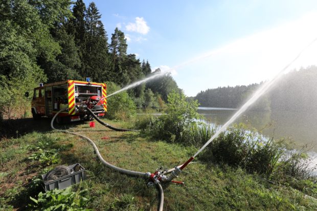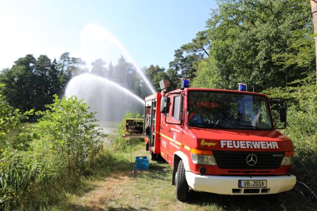 Bei dem zu Kippen drohenden Fischteich handelt es sich um den Habertshäuserteich im Wald bei Erbenhausen. Wie vor Ort mitgeteilt wurde, beträgt die Wassertemperatur in einem Meter Tiefe noch 30 Grad Celsius. „Einige Fische sind leider schon verendet“, so die Einsatzkräfte vor Ort. Mit Pumpen versuchen nun Feuerwehrleute das Wasser des Teichs in Zirkulation zu versetzen und zeitgleich mit Strahlrohren eine Sauerstoffanreicherung herbeizuführen. Laut ersten Angaben soll der Einsatz in den nächsten Tagen intensiviert werden. In dem Teich sollen sich mehr als 1000 Fische wie Forellen, Hechte oder Zander befinden.