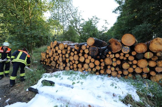 Der brennende Holzstapel wurde von ebenfalls rund 30 Feuerwehrleuten in einem Waldstück an der Landesstraße zwischen Atzenhain und Bernsfeld gelöscht. Es handelte sich um Wertholz auf einem Lagerplatz. Zwei Feuerwehrtrupps bekämpften den Brand mit zwei Strahlrohren. Vor Ort waren die Einsatzabteilungen der Freiwilligen Feuerwehr der Gemeinde Mücke aus Atzenhain, Bernsfeld und Nieder-Ohmen. Eine Streife der Polizeistation Alsfeld nahm die Ermittlungen zur Brandursache auf, die noch unklar ist. Gemeldet wurde das Feuer durch einen Autofahrer, der die Rauchentwicklung von der Landesstraße aus entdeckte.