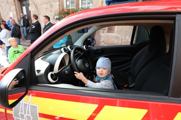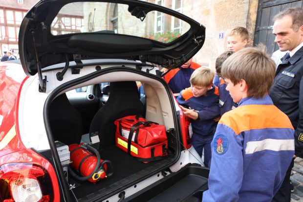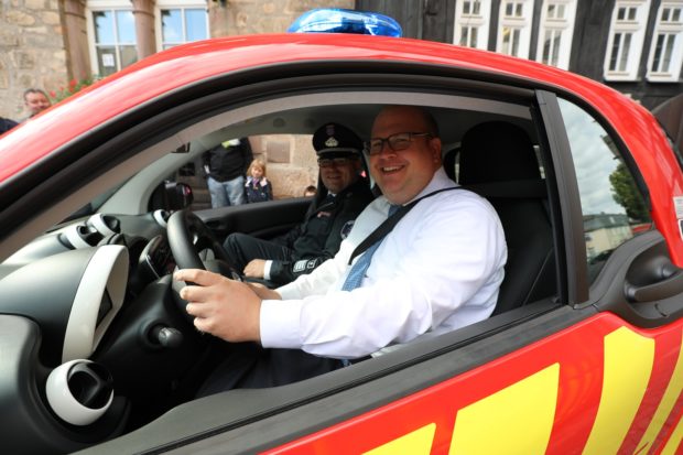 Der Vorsitzende des Alsfelder Feuerwehrvereins Carsten Schmidt präsentierte den gespendeten Personenkraftwagen als Eyecatcher für die Freiwillige Feuerwehr. Das Fahrzeug soll jedoch nicht nur als Werbeträger für das Ehrenamt dienen, sondern auch die Ehrenamtlichen bei Versorgungsfahrten, Brandschutzerziehungen oder dem Besuch von Lehrgängen und Ausbildungen entlasten. „Das Feuerwehrauto ist aber auch überall eine Anlaufstelle für hilfesuchende Bürger“, warb Schmidt zu dem 274 Zentimeter langen, 168 Zentimeter breiten und 165 Zentimeter hohen Einsatzfahrzeug.