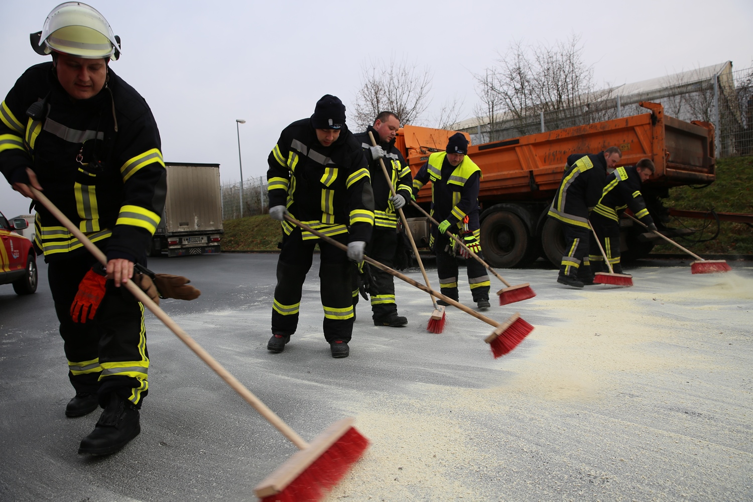 Die Feuerwehr mit Bindemittel und Besen bei der Beseitigung einer Ölspur. Foto: Philipp Weitzel