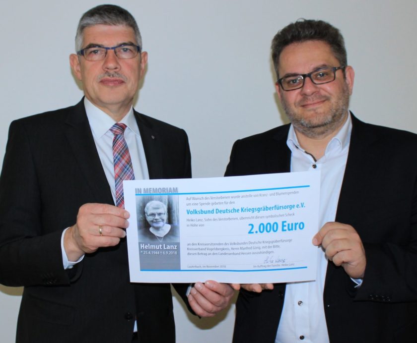 In der Pressemitteilung des Kreises heißt es, der Sohn von Helmut Lanz, Heiko Lanz, überreichte nun im Lauterbacher Kreishaus einen symbolischen Scheck an den Kreisvorsitzenden des Volksbundes Deutsche Kriegsgräberfürsorge, Manfred Görig. Der Landrat soll sich sehr über die große Spendenbereitschaft gefreut haben und werde nun den Betrag dem Landesverband Hessen weiterleiten.