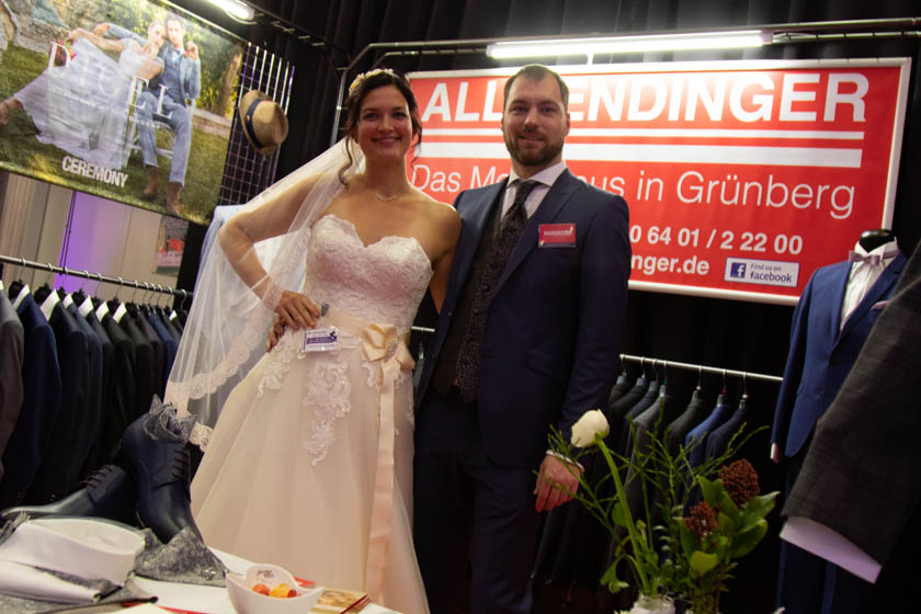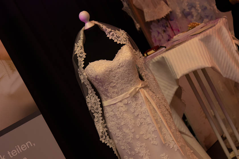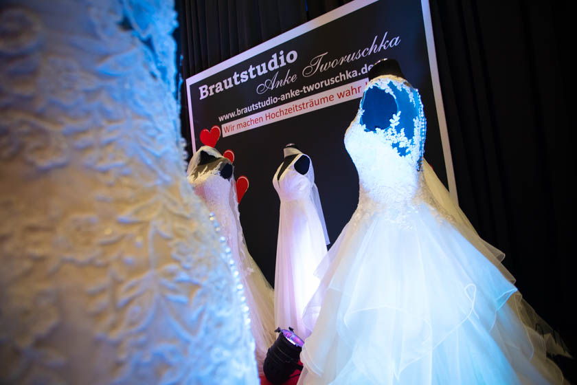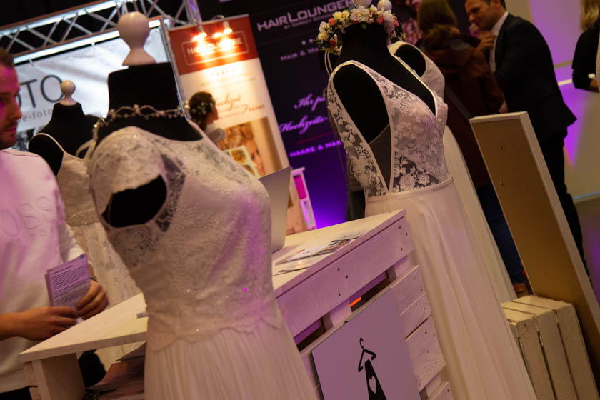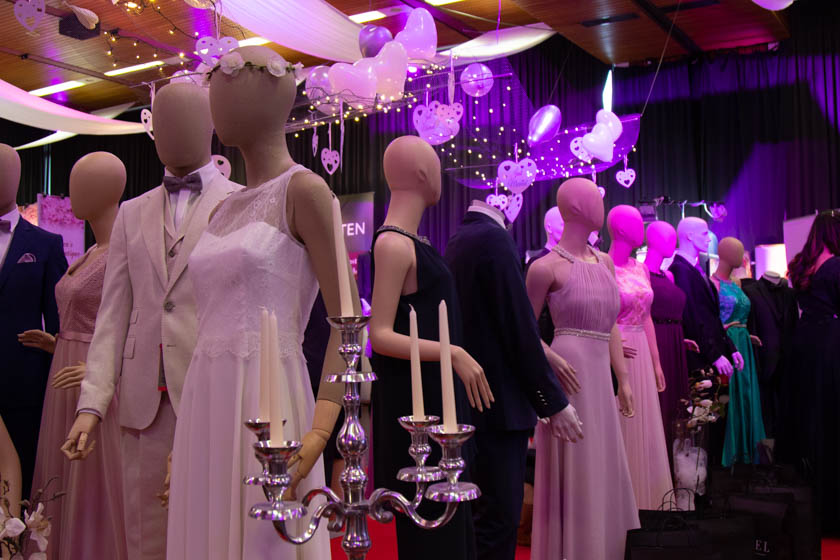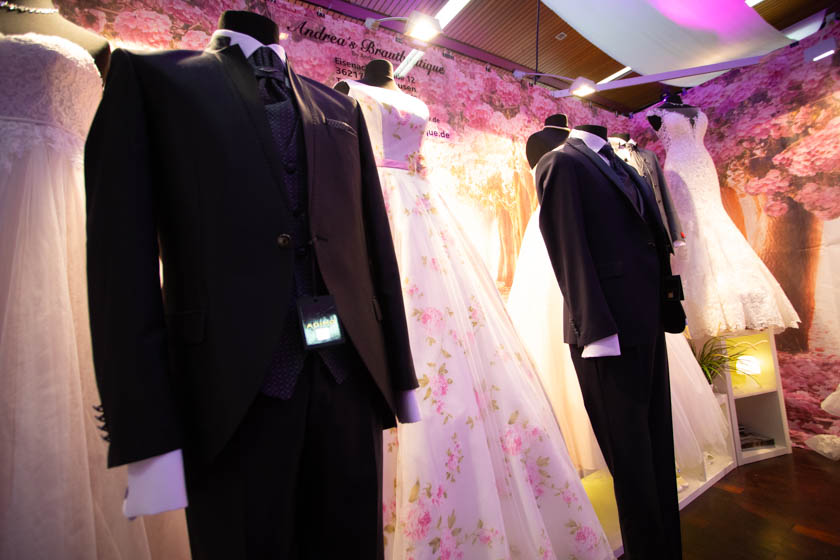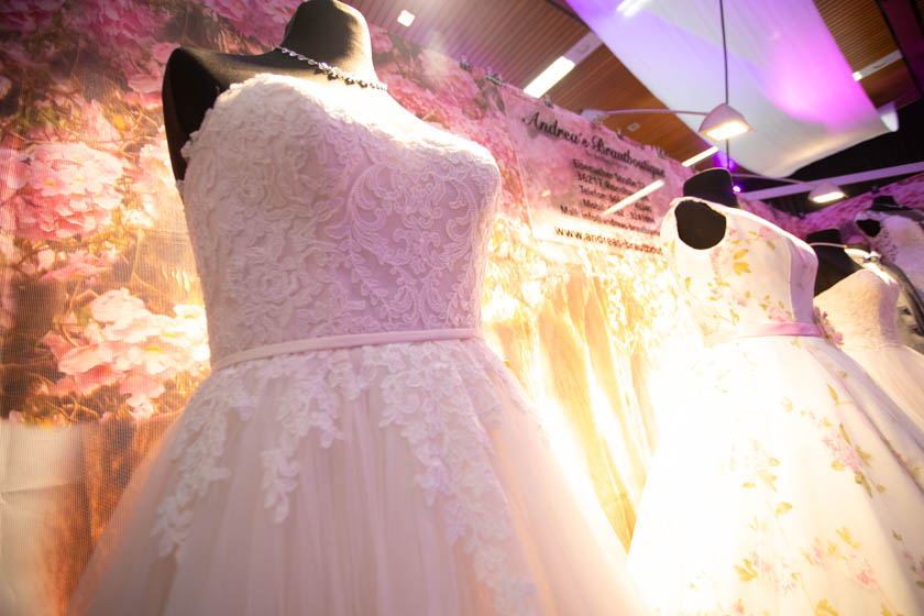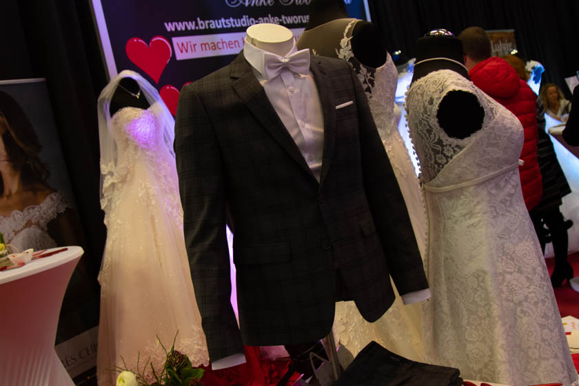 Doch nicht nur der richtige Ring spielt bei einer Hochzeit eine große Rolle, sondern auch das Outfit, beziehungsweise das Kleid und der Anzug. Insgesamt sechs Aussteller präsentierten eine große Auswahl an Braut – und Herrenbekleidung: Andreas Brautboutique, das Modehaus Allemdinger, das Modehaus Heynmöller, Brautkleid ², das Brautstudio Anke Tworuschka sowie Donna Fashion ließen mit ihren Brautkleidkreationen Mädchenträume wahr werden.