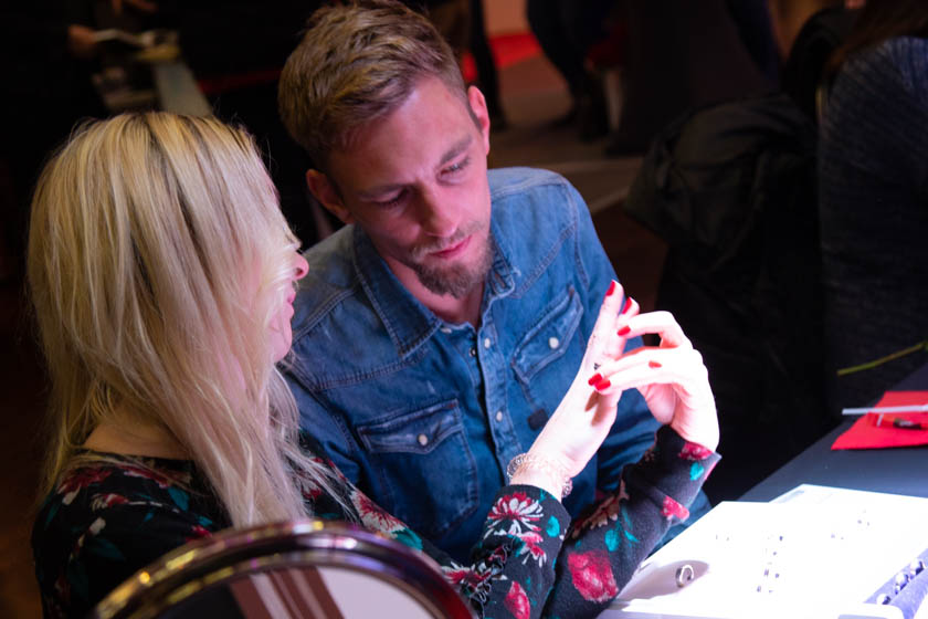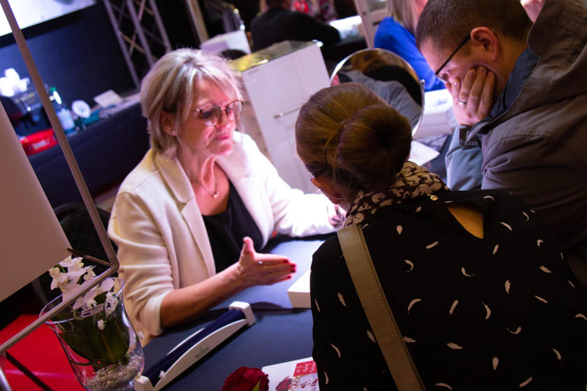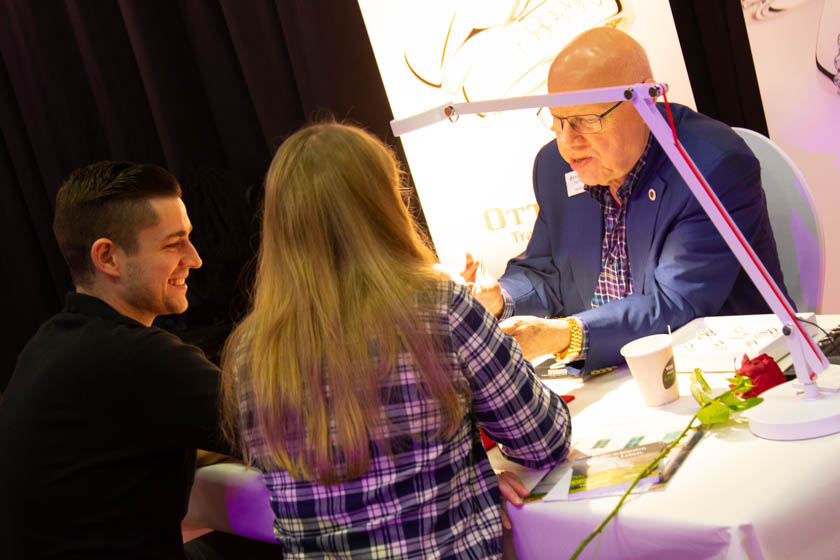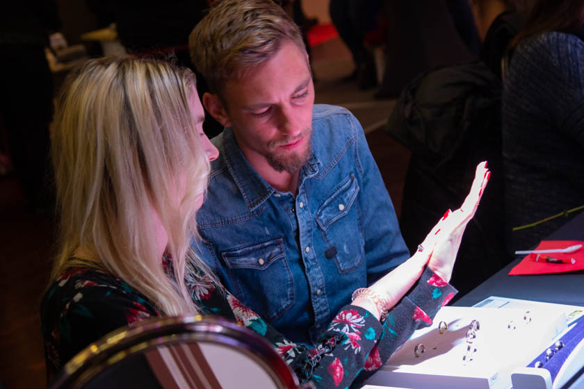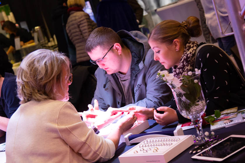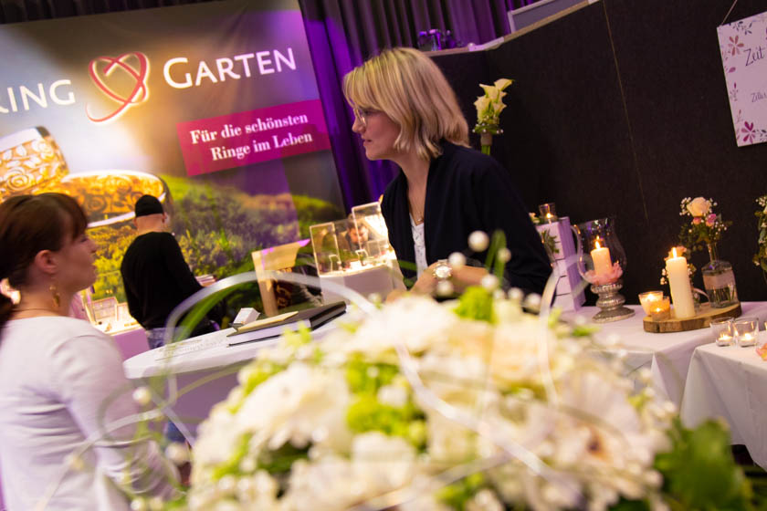 Besonders großer Andrang herrschte bei den Juwelieren Wirkner und Parr. Hier ließen sich Paare in aller Ruhe rund um das Thema Trauring beraten und probierten nach und nach verschiedene Ringe an. Vom klassischen Ring in gelbgold mit kleinem Stein, über eine roségoldene Variante bis hin zur modernen Version aus Platin, die Auswahl war riesig. Auch beim Stand von Trauring Garten Fritzlar konnte man in aller Ruhe in kleinen Separees den einen Ring anprobieren, der am großen Tag das klassische Symbol der Verbundenheit zweier Liebenden darstellt.