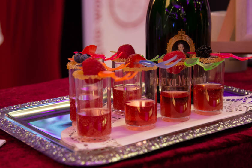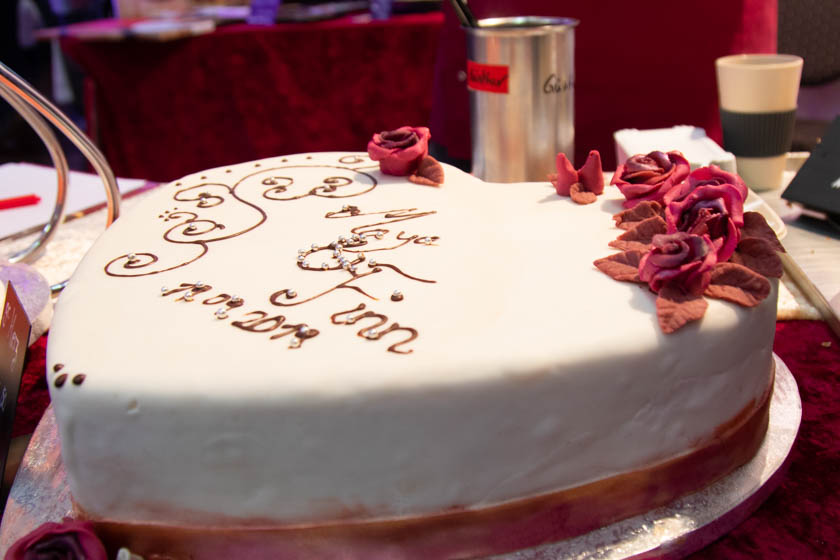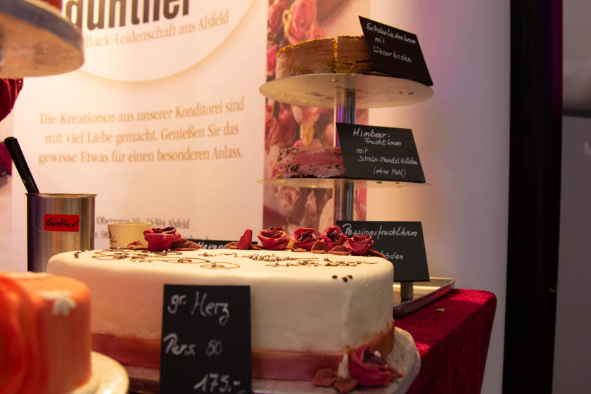 Etwas das auf einer Hochzeit selbstverständlich nicht fehlen darf, die Hochzeitstorte. Birgit Günther hatte wieder einige ihrer aufwendigen Kreationen mitgebracht, und diese Leckereien durfte man natürlich wieder verköstigen. Im vergangenen Jahr war besonders die Verliebt-Verlobt-Verheiratet-Torte sehr beliebt, eine dreistöckige Torte, die für das Kennenlernen, die Verlobung und Trauung steht. In diesem Jahr sei Korall eine Trendfarbe was das Äußere angeht, beliebte Füllungen seien immer noch Passionsfrucht, Himbeere und Schokolade – gerade bei dreistöckigen Torten eine beliebte Kombination.