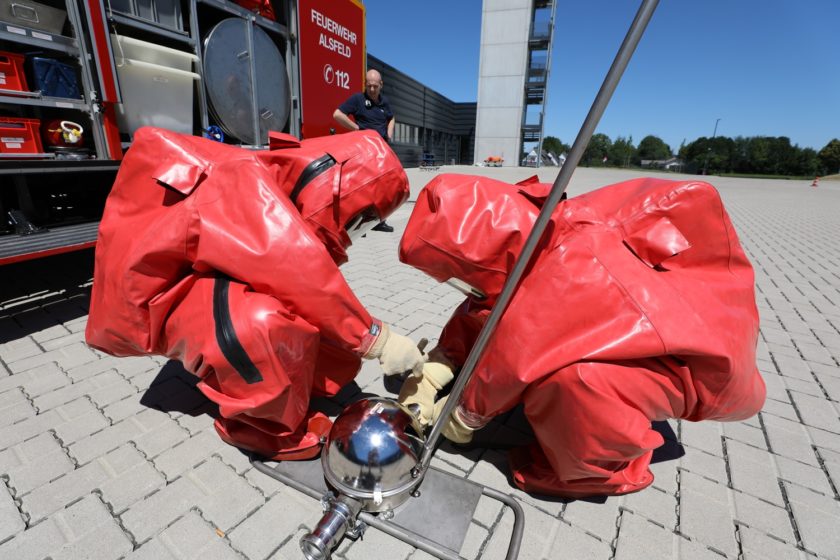 Zuständig für das spezielle Training waren die Alsfelder Ausbilder Ralf Braun, Sascha Knaust und Kevin Planz. Sie erläuterten die spezielle Schutzwirkung der Anzüge und ihre Einsatzmöglichkeiten, so können die Anzugsträger von der Atmosphäre abgeschlossen für eine begrenzte Zeit an Orten mit giftigen Gasen oder ätzenden Säuren eingesetzt werden.