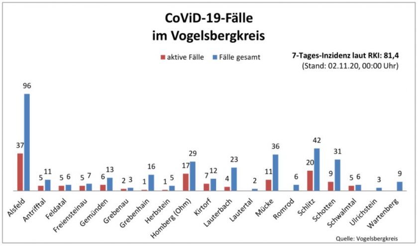 Mit 37 aktiven Fällen verzeichnet die Kommune Alsfeld die meisten aktiven Corona-Fälle. Fast jede Vogelsberger Kommune hat bislang mindestens einen aktiven Fall. Einzig Lautertal, Romrod, Ulrichstein und Wartenberg sind bislang weiterhin „coronafrei“.