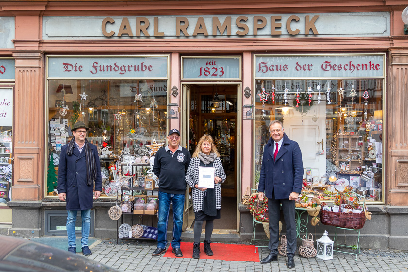 Nach Inkognitobesichtigung und Testkauf durch Jury-Mitglieder, fiel die Entscheidung nicht sonderlich schwer: das Traditionsgeschäft Ramspeck ist eines von insgesamt fünf Lieblingsladenlokalen 2020 in ganz Hessen. Die mit einem Preisgeld versehene Auszeichnung wurde vom Präsident des hessischen Einzelhandelsverbandes, Jochen Ruths, und dem Jury-Mitglied Axel Funke in kleinem Rahmen vor Ort übergeben. Dabei wurde nicht nur das schon legendäre Ladenkonzept an sich, sondern auch der Mut zur Übernahme in dieser schwierigen Zeit nochmals ausdrücklich gewürdigt.