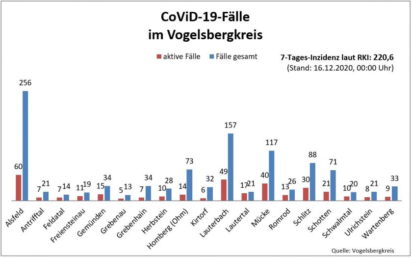 Seit Beginn der Woche haben sich insgesamt 68 Personen als genesen gemeldet. Das Robert-Koch-Institut weist für den Vogelsbergkreis eine Sieben-Tages-Inzidenz von 220,6 aus.
