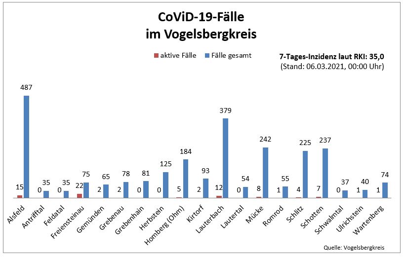 Aktuell betreut die Behörde 82 aktive Fälle. Das Robert-Koch-Institut weist für den Vogelsbergkreis eine Sieben-Tages-Inzidenz von 35,0 aus.