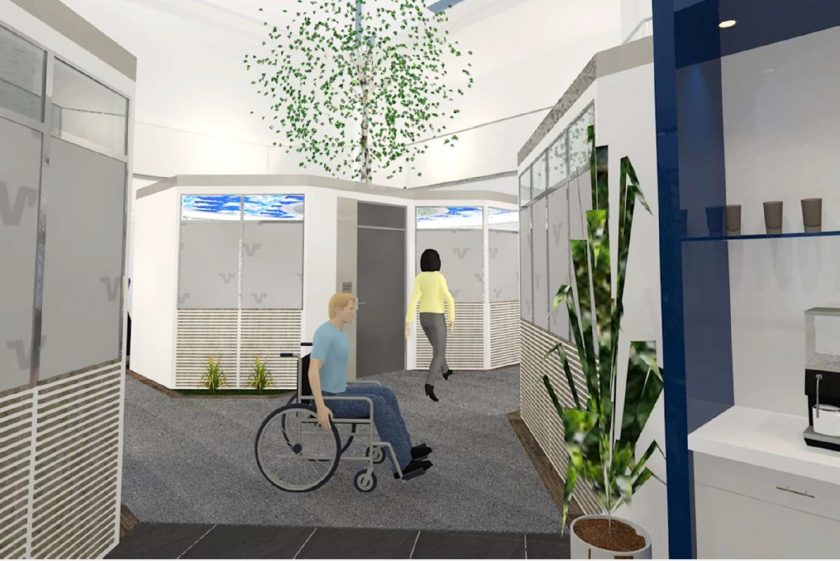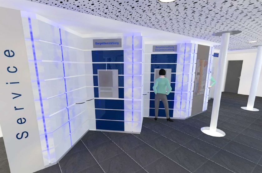 Auf der rechten Seite des Haupteingangs wird der Service – und Selbstbedienungsbereich mit zwei offenen Servicepoints sowie den Geldautomaten zu finden sein. Durch die seitlich versetzte Anordnung der Automaten sowie einer Tür zum Einzahlungsbereich soll mehr Diskretion geschaffen werden. Der SB-Bereich werde zudem einen eigenen Eingang bekommen. Darüber hinaus soll die gesamte Geschäftsstelle ebenerdig gestaltet und mit Frischluft klimatisiert werden.