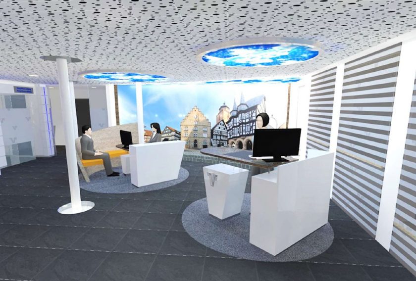 Ein Blick in den neuen Servicebereich. Im Hintergrund die Panoramawand mit Marktplatz-Motiv. Abbildungen: BPP Büro-Projektplan