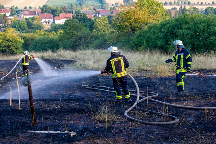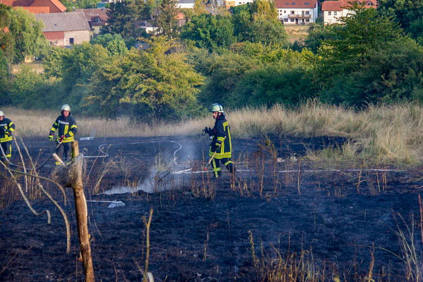 HOPFMANNSFELD (ol). Auch in Hopfmannsfeld war es ein Flächenbrand, der am Mittwoch die Feuerwehr auf den Plan rief. Rund 2.500 Quadratmeter Wiese samt Gestrüpp standen in Flammen.
