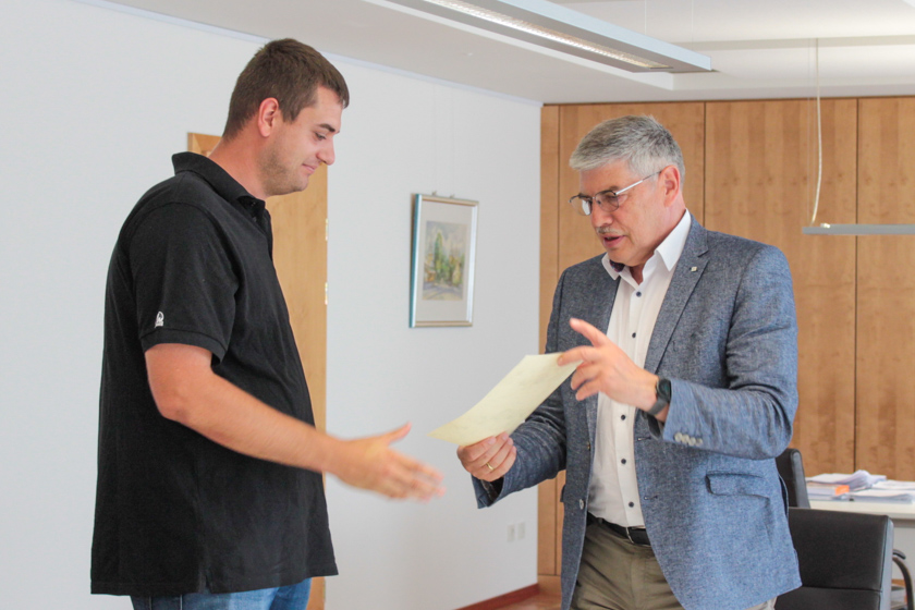 Landrat Manfred Görig (rechts) überreicht die Berufungsurkunde an Kevin Klinkenberg, nun einer der Bienensachverständigen des Vogelsbergkreises. Foto: Vogelsbergkreis/C.Lips