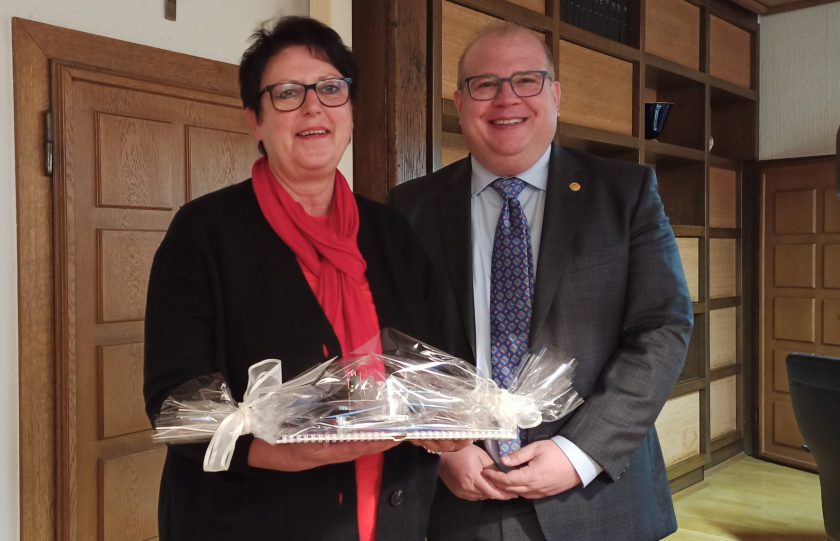ALSFELD (ol). Zu einer kleinen Verabschiedung lud Bürgermeister Stephan Paule kürzlich ins Rathaus ein. Nach acht Jahren eigenem Betrieb und insgesamt 38 Jahren Tätigkeit hat Rita Thamer Ramspecks Weinkeller abgegeben.