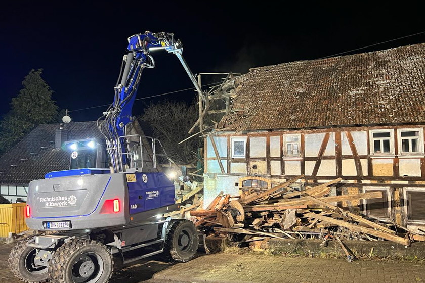 Deswegen befanden sich mehrere Fachgruppen im Einsatz, um das Gebäude koordiniert niederzulegen. Mit schweren Bergeräumgeräten (Radlader) sind die Ortsverbände Steinau, Groß-Gerau und Eschwege im Einsatz. Der Bewohner wurde evakuiert und anderweitig im Ort untergebracht, so das THW. Gegen 4 Uhr morgens am Heiligabend konnte der Einsatz schließlich beendet werden. Die Scheune wurde niedergelegt und keine Personen sind zu Schaden gekommen.