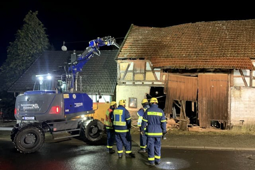 Gegen 16 Uhr wurde der Ortsverband Alsfeld mit dem Technischen Berater Bau alarmiert. „Nachdem zunächst der Technische Berater Bau aus Alsfeld die Statik des Gebäudes prüfte, wurde der sofortige Abriss beschlossen“, heißt es in der Meldung weiter. Die Scheune drohe nämlich auf das bewohnte Nachbarhaus zu stürzen.