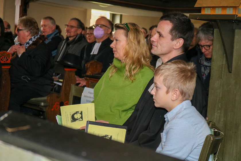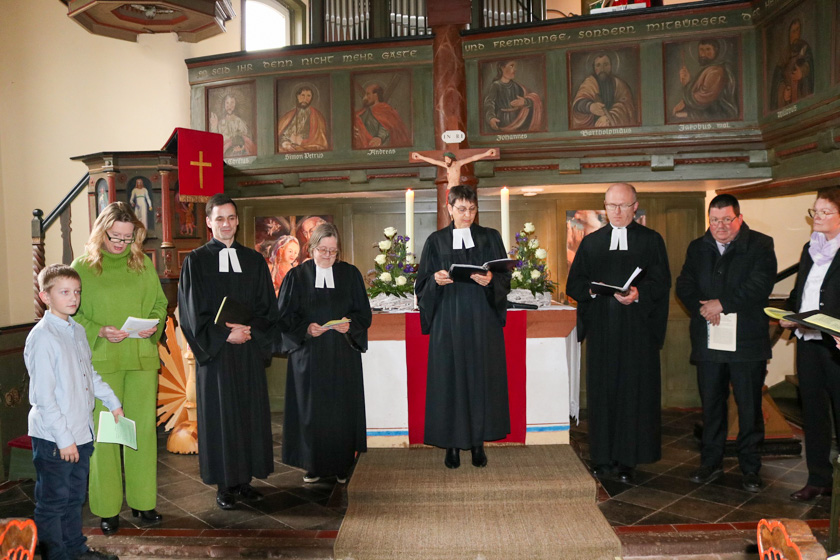 Sowie Pfarrer Toralf Kretschmer und Pfarrerin Christine Müller, die in Grebenau, Schwarz und Udenhausen Meyers Vikariat begleitet hatten, dazu Phil Meyer und Nicole Kaufmann als Assistierende aus dem privaten Umfeld des Pfarrers.