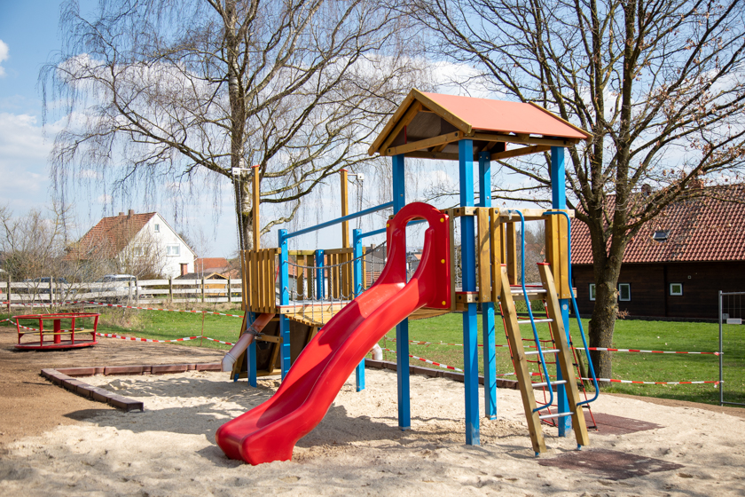 Noch ist der Spielplatz abgesperrt. In wenigen Wochen kann dann auch wirklich darauf gespielt und auch die neuen Geräte getestet werden.