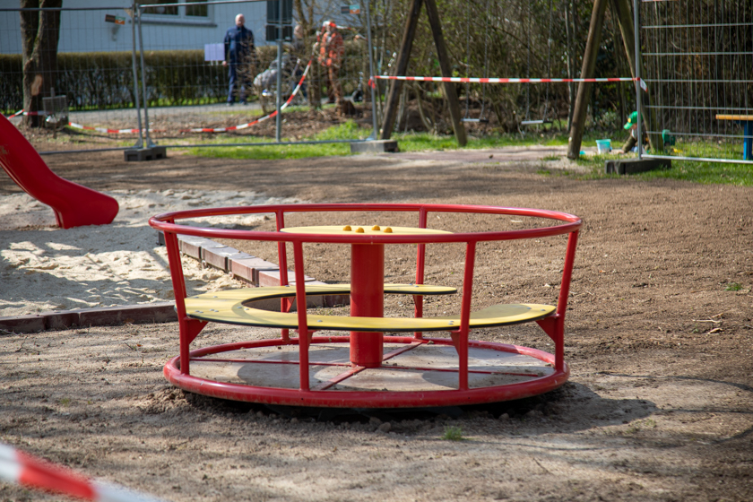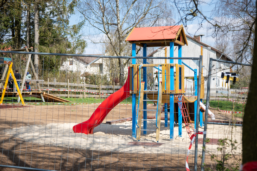 Noch ist der Spielplatz abgesperrt. In wenigen Wochen kann dann auch wirklich darauf gespielt und auch die neuen Geräte getestet werden.