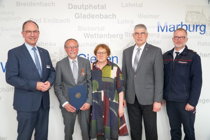 Seine Notarzt-Jacke hat der 72-Jährige inzwischen an den Nagel gehängt. Aber: „So ganz aufhören kann und will ich nicht“, schmunzelt der Dautphetaler. Insgesamt waren es mehr als dreieinhalb Jahrzehnte, in denen er das Rettungsdienstwesen geprägt und vorangebracht hat. Dafür erhielt er aus den Händen des Gießener Regierungspräsidenten Dr. Christoph Ullrich das Verdienstkreuz am Bande der Bundesrepublik Deutschland. „Sie haben sich um den Rettungsdienst im Landkreis Marburg-Biedenkopf und im Vogelsbergkreis, aber auch weit darüber hinaus verdient gemacht“, würdigte Ullrich im Beisein von Ehefrau Dr. Doris Bielefeld und teils langjährigen Weggefährten.