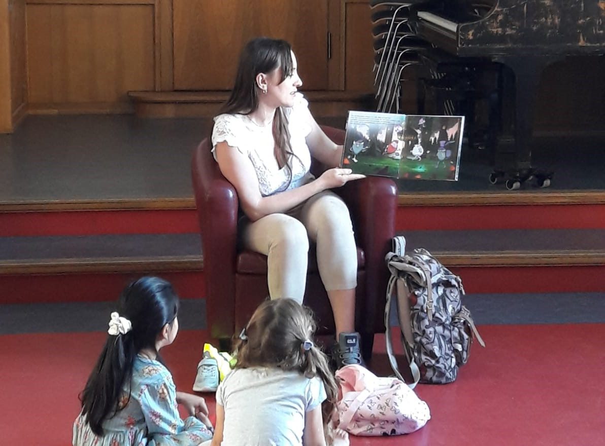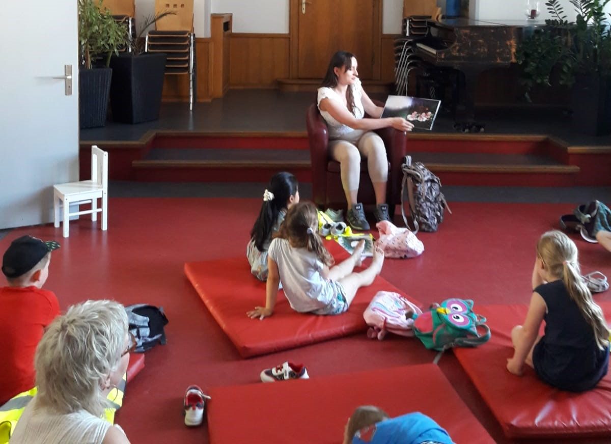 Die Angestellte des MoonWalker-Verlages stellte in einer interaktiven Lesung das Buch „die drei Muckeltiere und der Wüterix“ vor. In kindgerechter Form wird das Thema Emotion  und Wut, sowie der richtige Umgang mit dieser, behandelt. Die Kinder gehen zusammen mit den drei Muckeltieren auf Abenteuerreise, welche mit ihrer sanften Art eine besondere Gabe haben Streit zu schlichten.