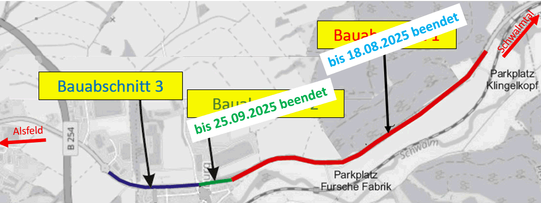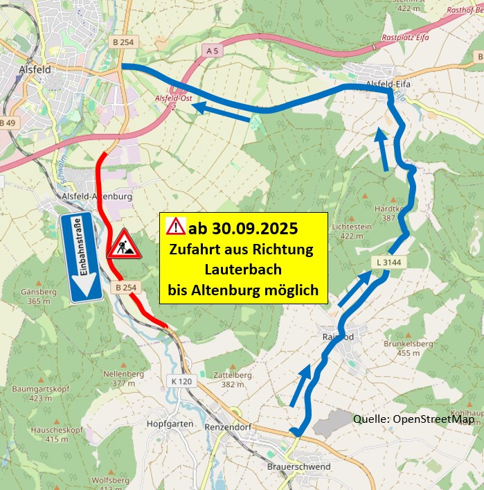Aller Voraussicht nach gibt es jedoch ab Dienstag, den 30.09.2025 hier eine kleine Änderung in der Verkehrsführung. Ab diesem Zeitpunkt können Altenburg und auch das Gewerbegebiet Altenburg von Lauterbach kommend auf direktem Wege über die Bundesstraße erreicht werden. Der Verkehr ist damit in Richtung Alsfeld bis zur Kreuzung Altenburg freigegeben.