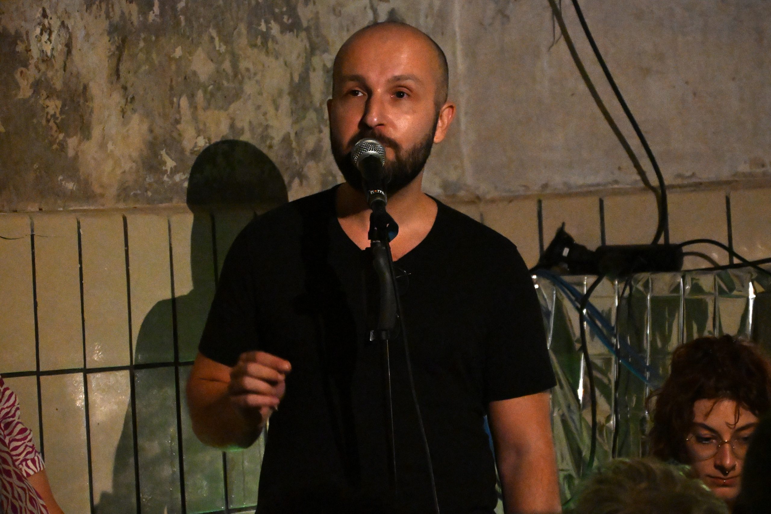Richtig witzig dagegen war der Beitrag des Mainzers Lenny Felling – auch wenn das Thema, die Beerdigung seiner Großtante – eher traurig war. Nicht bei ihm und seiner Familie, die angeblich nur mit veränderten Namen dafür Patin stand, dass man mit einer guten Ausstattung an Alkohol und Süßigkeiten jede Beerdigung zu einem für alle Beteiligten unvergesslichen Ereignis machen kann. Die Geschichte, gepaart mit absurden Ideen und ganz viel Wortwitz, begeisterte das Publikum im Bananenkeller sehr. Genauso wie die nächste Poetin, wenn auch ihr Betrag wieder sehr ernsthaft war: Lisa Thiel ist Slam Poetin aus Marburg. Sie verpackte ihre Erfahrungen als Therapeutin in berührende Worte; ihre Hilflosigkeit artikulierte sie mit den Worten „Ich bin eine Lügnerin“. Und dennoch: Hoffnung machen, ist das Einzige, was zählt. Wie die Poeten vor ihr auch der letzte Poet der Riege, Artem Zolotarov aus Mainz, flocht Lisa Thiel aktuelle Bezüge ein. Die Poeten warben in ihren Texten und Ansagen für eine offene, vielfältige Gesellschaft. Artem Zolotarov mahnte in seinem Beitrag explizit vor Gier und Dummheit, vor kurzen Erfolgen, vor dem Hunger der Affen auf die Bananen. Dabei zog er ganz konkret Vergleiche zur Nazizeit und beschrieb eine stille Resignation den heutigen Zuständen gegenüber.