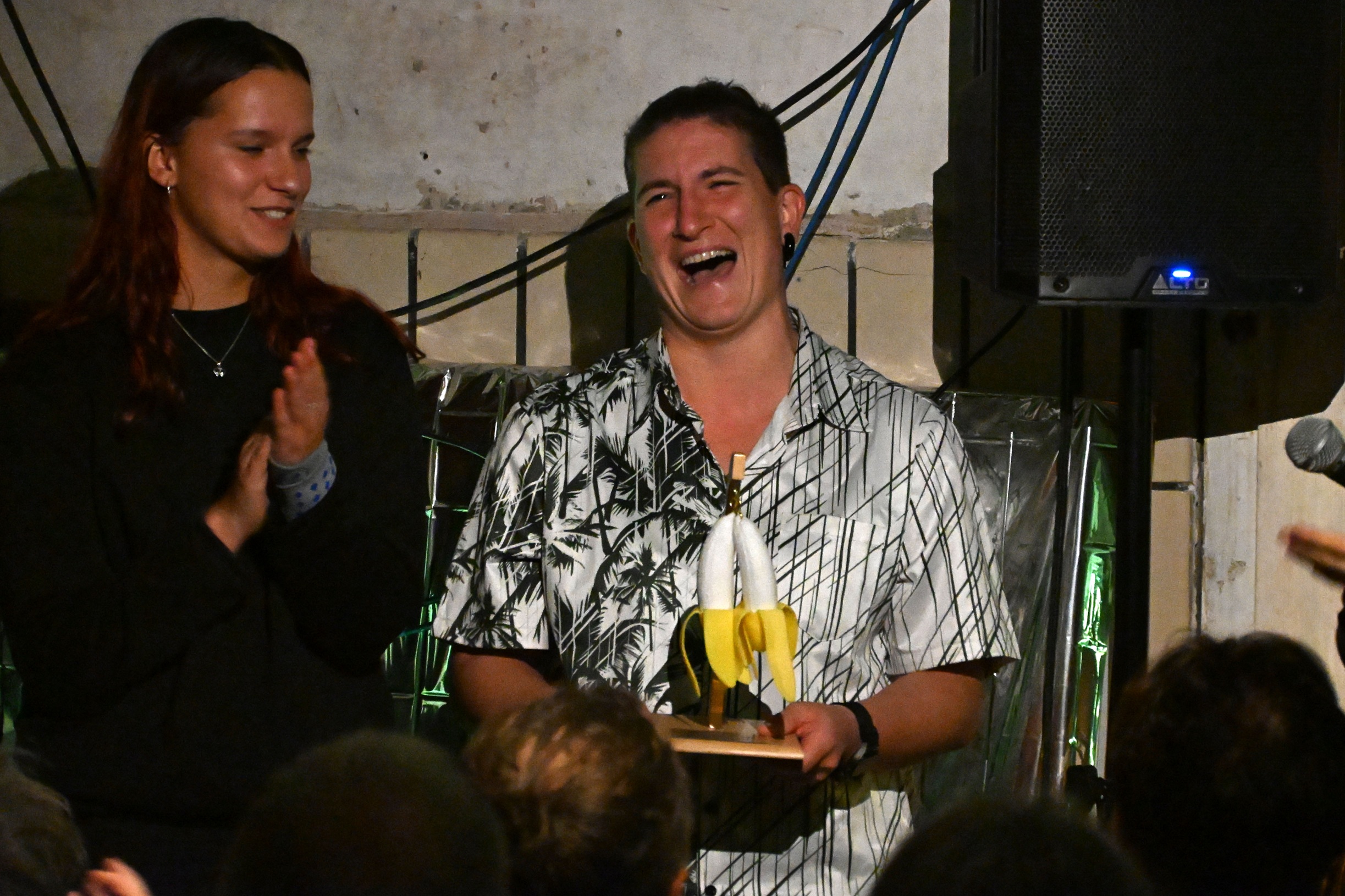 Die zweite Runde des Slams verlief so abwechslungsreich wie die erste: Vom Funken des Muts zum Widerspruch, über die Verlockungen des Alkohols bis hin zu einem wahnwitzigen Wortspiel hatten Kaddy Kupfer, Ilse und Lenny Felling ihre Texte gestreut. Lisa Thiel beschrieb sehr eindrücklich das Verschwinden einer Frau mit Demenz, und Artem Zolotarov schließlich trug einen fiktiven Liebesbrief Franz Kafkas vor. Alle Texte nahmen das Publikum gefangen, sodass die Kür des Siegers oder der Siegerin schwerfiel. Slam-Masterin Stella Jantosca gelang es, das Publikum so zu motivieren, dass am Ende natürlich eine Siegerin gefunden war: Kaddy Kupfer konnte den Bananenpokal, den Silvia Grahmann-Gerhardt eigens für diesen Slam gebastelt hatte, mitnachhause nehmen. Doch auch bei den anderen Poetinnen und Poeten war die Stimmung gut – sie kennen und schätzen sich und gönnen sich den Sieg. Viel mitnachhause zu nehmen hatten auch die Gäste: Sie hatten an diesem Abend viele kluge Gedanken geschenkt bekommen, großartigen Wortwitz und jede Menge Hoffnung.