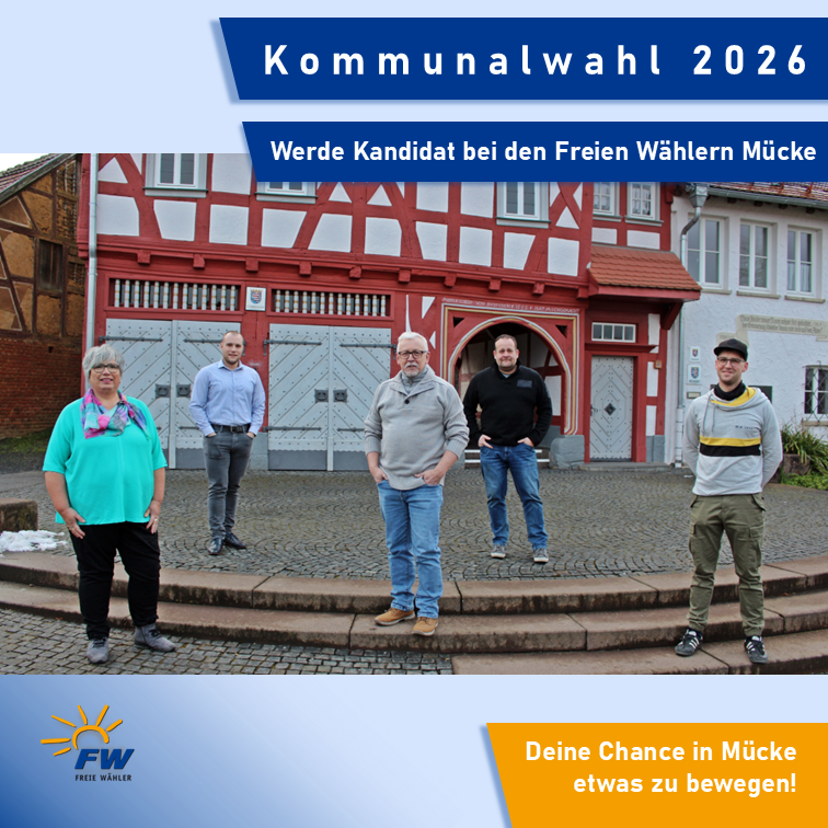 Die Freien Wähler Mücke rufen Bürgerinnen und Bürger in einer Pressemitteilung dazu auf, bei der Kommunalwahl im März 2026 zu kandidieren und die Entwicklung der Gemeinde aktiv mitzugestalten. Die kommenden fünf Jahre bringen Herausforderungen und Chancen, um Mücke weiter voranzubringen. Wer Verantwortung übernehmen möchte, finde bei den Freien Wählern ein Umfeld für unabhängiges, sachorientiertes Arbeiten – seit über fünf Jahrzehnten stehe die Wählergemeinschaft dafür ein.