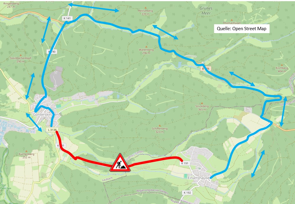 Hessen Mobil führt laut einer Pressemitteilung im Auftrag des Vogelsbergkreises punktuelle Fahrbahninstandsetzungen an der K 191 zwischen Laubach/Gonterskirchen und Schotten/Einartshausen durch. Im Zuge der Arbeiten ist eine Vollsperrung
