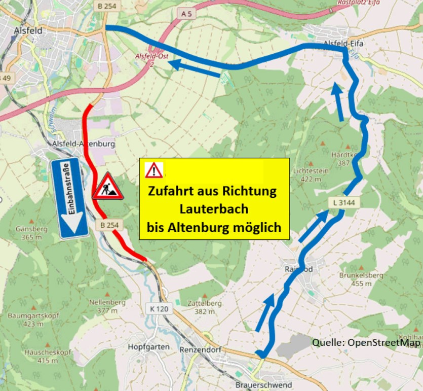 Durchgangsverkehr voll gesperrt und die Verkehrsteilnehmenden werden ab dem Abzweig bei Brauerschwend über Rainrod und Eifa in Richtung Alsfeld umgeleitet. Altenburg und auch das Gewerbegebiet Altenburg von Lauterbach kommend können weiterhin auf direktem Wege über die Bundesstraße erreicht werden.
