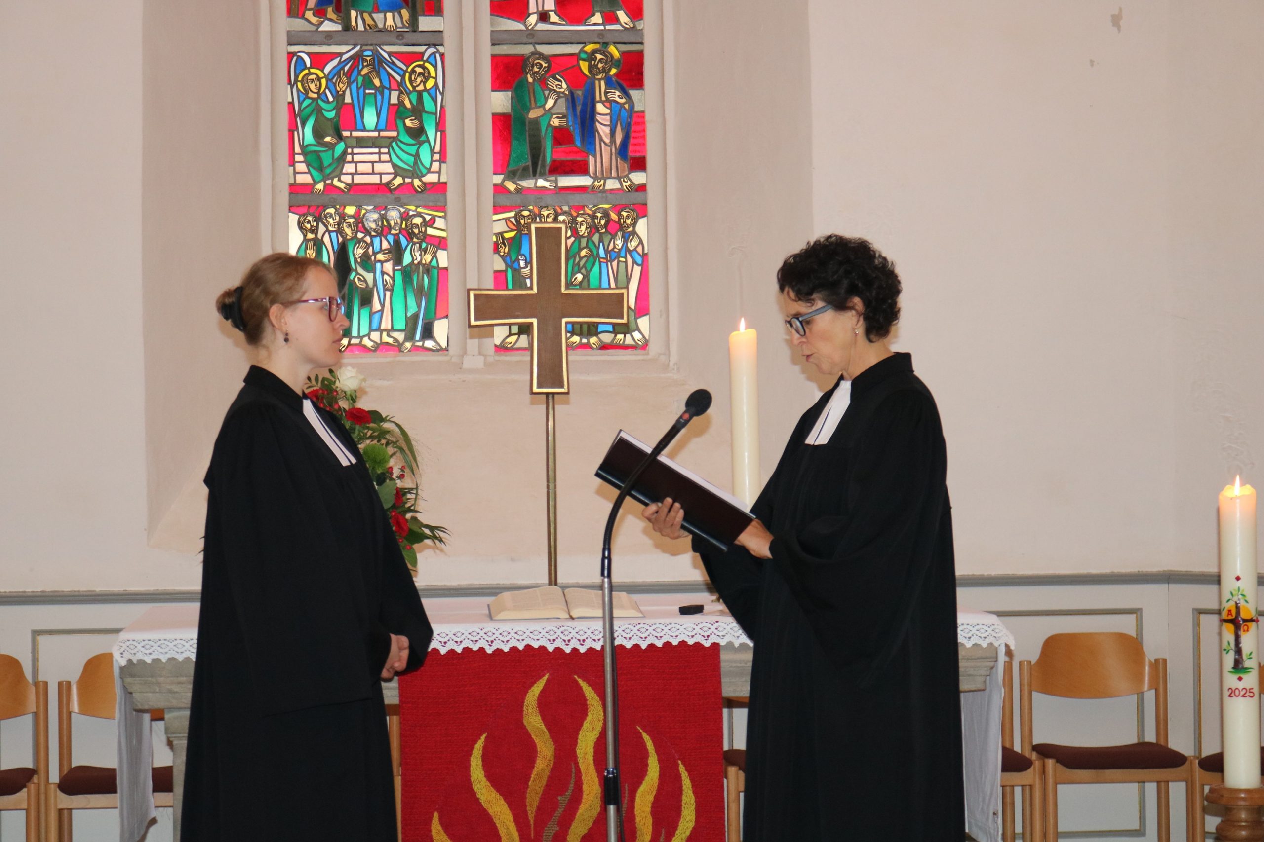 Nach der Eingangsliturgie durch Pfarrer Theo Günther schritt die Pröpstin zum Akt der Ordination. Dazu verlas zunächst Martin Reibeling, kommissarischer Präses im Dekanat, den Grundartikel, an dem sich die Verkündigung und das Handeln der EKHN orientieren. Er verpflichtet Pfarrerinnen und Pfarrer zu einem angemessenen Umgang mit dem Alten Testament unter stetiger Beachtung der jüdischen Wurzeln des Christentums mit dessen Auswirkungen und Verantwortlichkeiten in der Gegenwart.