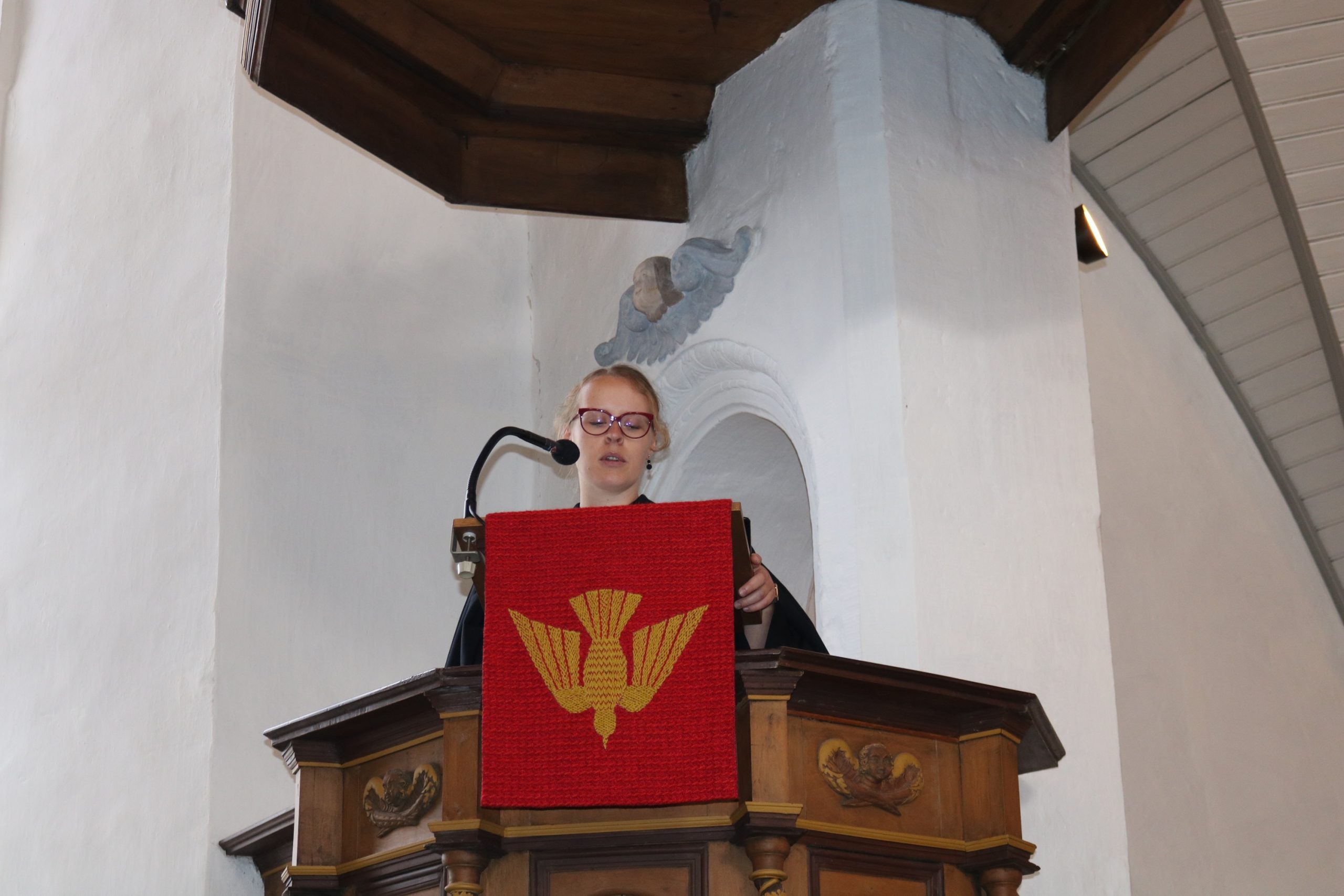 In ihrer Ansprache zur Ordination ging Anke Spory auf die Bedeutung dieses besonderen Schrittes im Leben einer jungen Pfarrerin ein. Ordiniert zu werden, bedeute, dass man mit der Verkündigung des Wortes Gottes beauftragt, dafür gesegnet und dazu gesendet werde. „Eine lebenslange Aufgabe“, sagte die Pröpstin, die sich wie die Gemeinde und das Dekanat sehr darüber freute, dass die junge Theologin sich für Romrod entschieden hat. „Sie bringen viel mit“, unterstrich Spory Simona Janssens Kompetenzen: Sie könne gut in Kontakt mit Menschen treten, sei voller Tatendrang und Freude. Sie wolle mit der Gemeinde leben und gleichzeitig das Priestertum aller Gläubigen voranbringen. Gott habe Simona Janssen berufen, sagte Spory in ihrer Ansprache, daher gehe es nicht um Perfektion, sondern um das gemeinsame Tun. „Die Ordination würdigt Veränderung und Entwicklung“, betonte die Pröpstin – auch dafür werde die junge Pfarrerin an diesem Tag gesegnet. „Ich wünsche Ihnen, dass Sie hier Wurzeln schlagen und Freude im Dienst empfinden.“ Segen zur Ordination überbrachten Pfarrerin Hanne Allmansberger Janssens Lehrpfarrerin aus Nidda, Pfarrer Johannes Schütz, langjähriger Weggefährte der jungen Pfarrerin, und Prädikantin und Kirchenvorsteherin Karin Zinßer sowie die Pröpstin selbst.