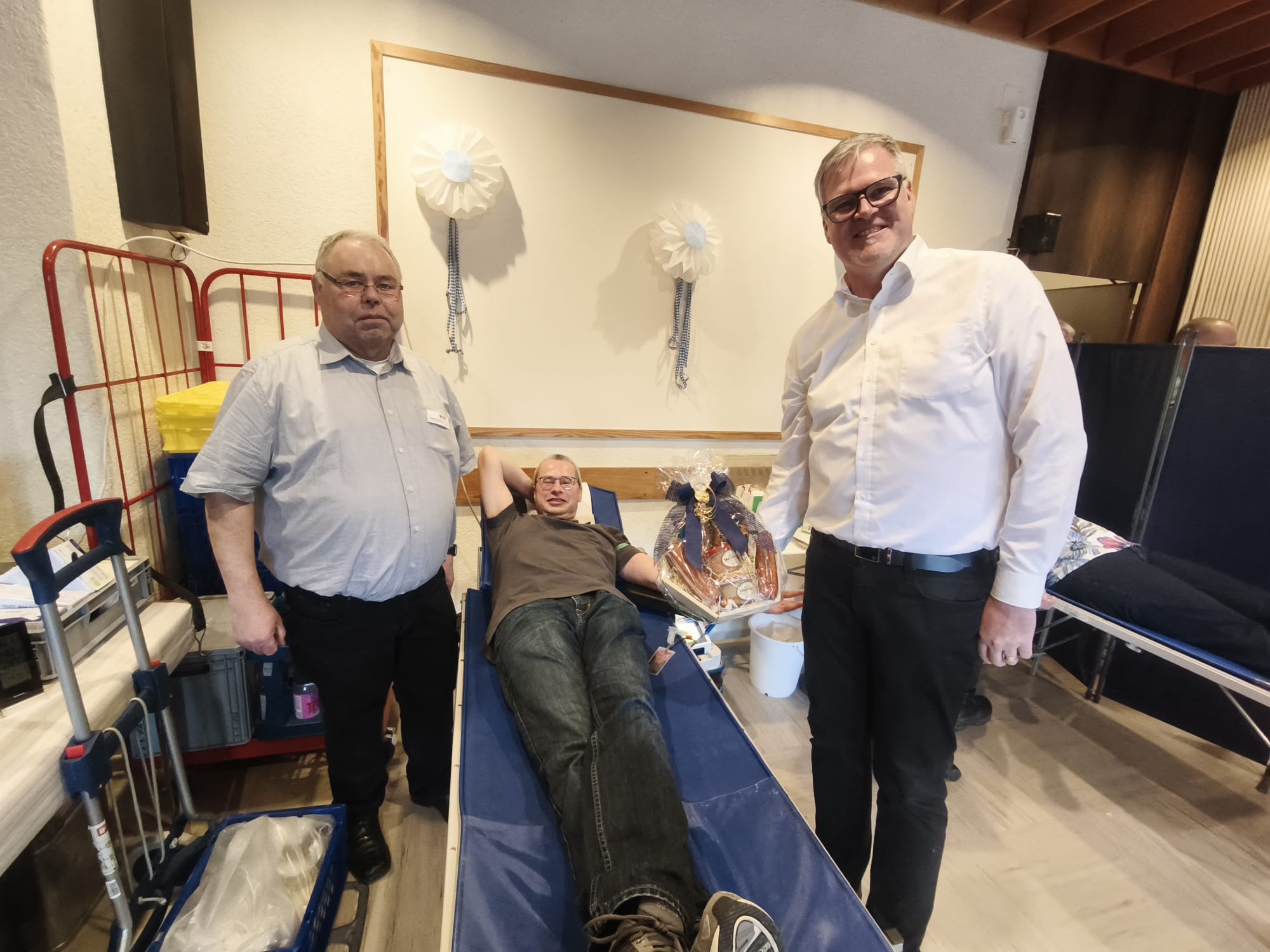 „Blutspender sind stille Lebensretter“, betont Bovensmann. „Ohne sie wäre moderne Medizin in vielen Bereichen gar nicht möglich.“ Ein besonderes Vorbild für alle Blutspenderinnen und Blutspender ist Klaus Schmidt aus Ruppertenrod: Er spendete in diesem Oktober bereits zum 150. Mal Blut – eine beeindruckende Zahl, die höchsten Respekt verdient. Für diese außergewöhnliche Leistung überreichten Markus Hildebrand vom Blutspendedienst und Matthias Weitzel, Vorsitzender des DRK Mücke, ein Präsent. „Ich freue mich, dass Klaus Schmidt so oft und mit so viel Engagement spendet“, sagte Bovensmann, der Schmidt seit Jahren persönlich kennt.