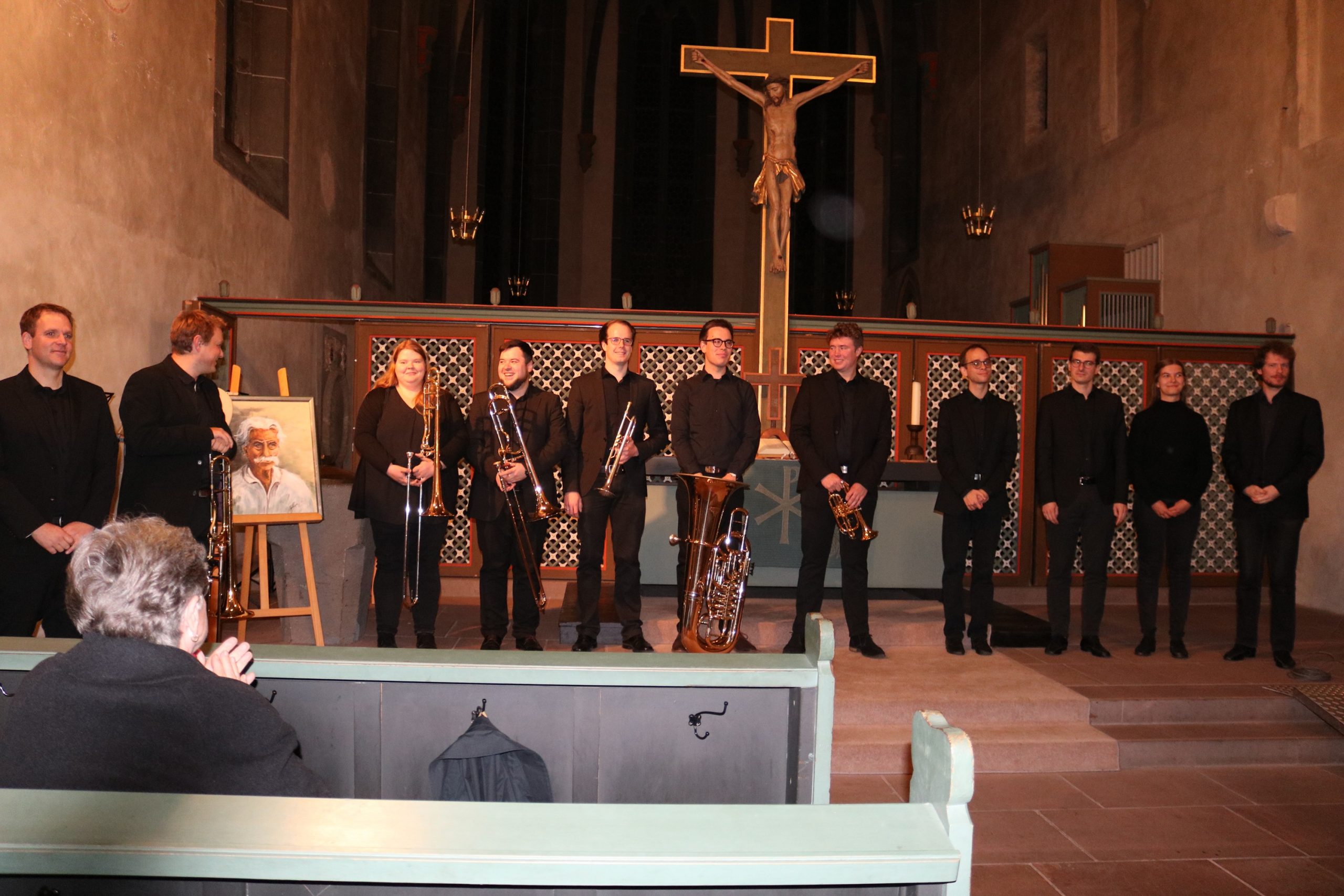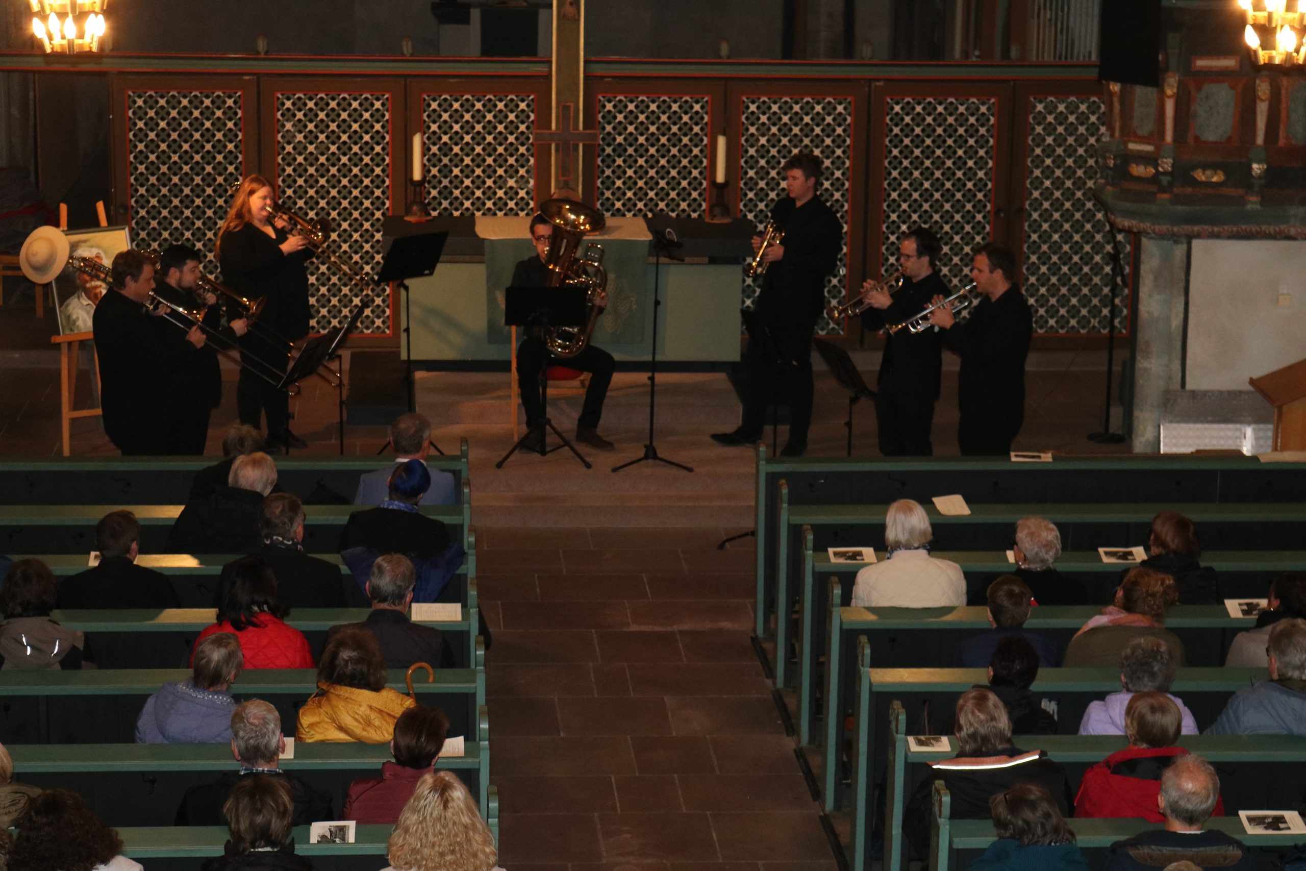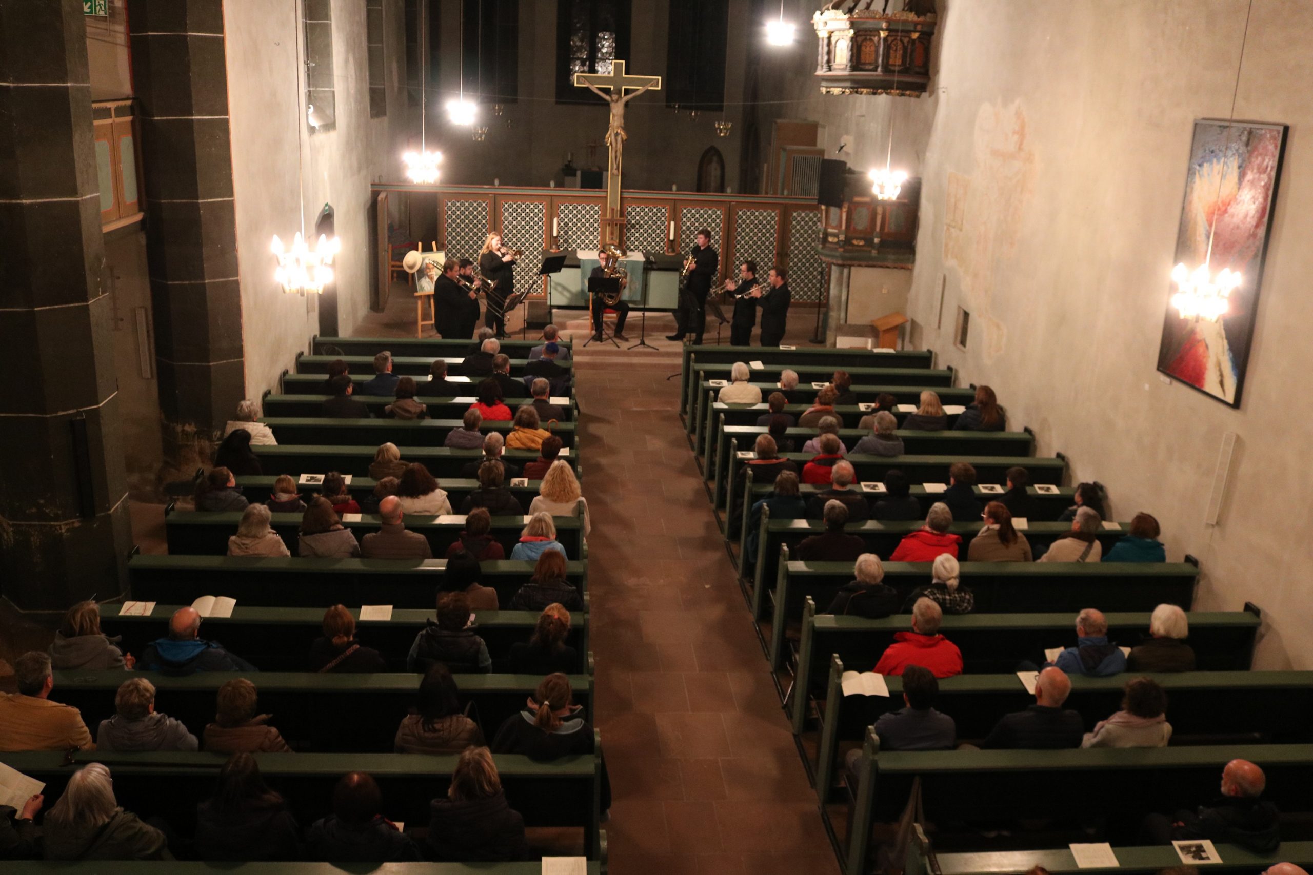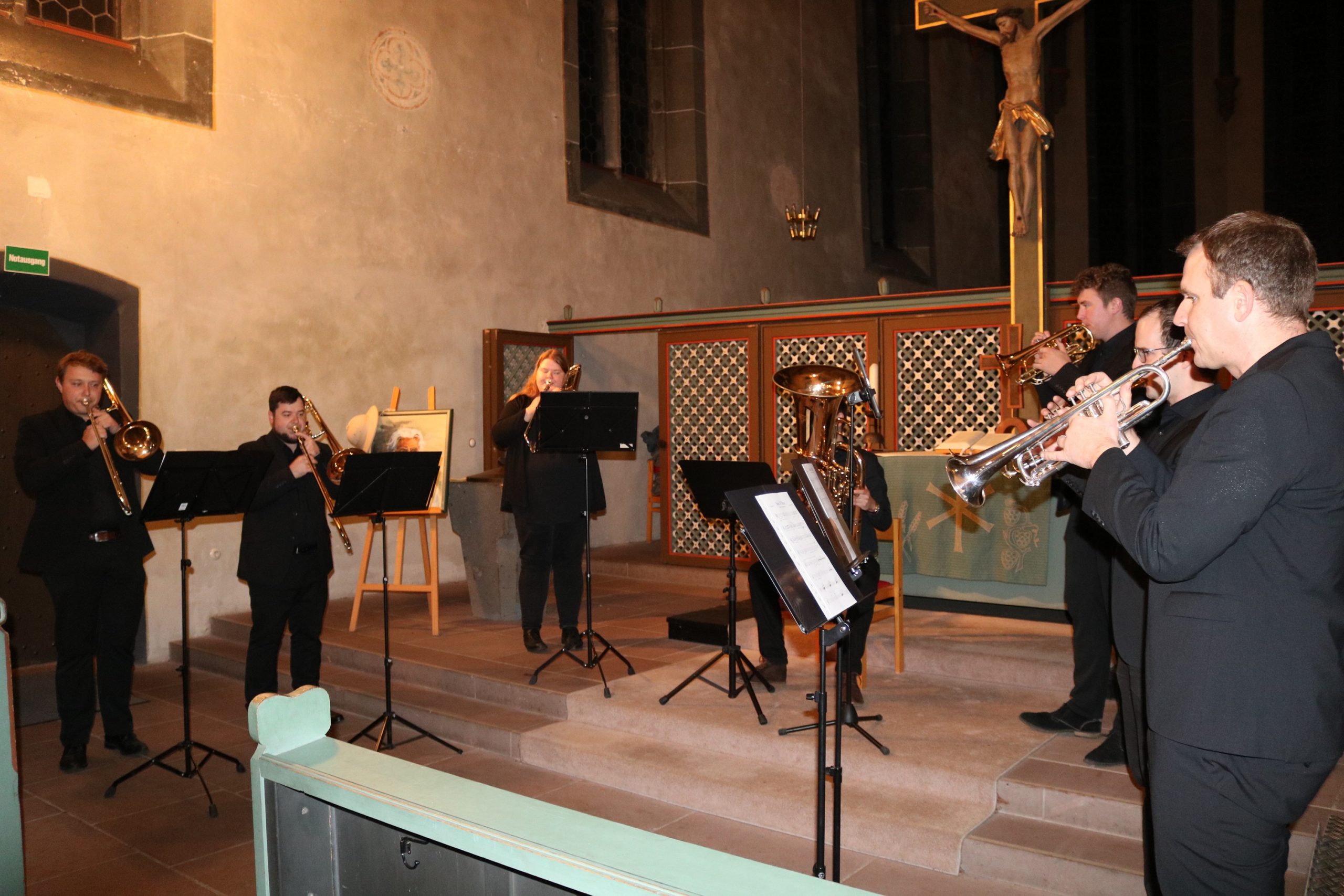 Dem improvisierenden Stück zu Beginn des Konzerts folgte die „Fantasie und Fuge g-Moll“ von Bach, mit Leidenschaft und großer Spielfreude dargeboten von Lukas Ruckelshausen, Kirchenmusiker in Frankfurt-Nied. Für einen Zeitsprung sorgte danach das Bläserseptett unter der Leitung von Martin Wilhelm, der an der Albert-Schweitzer-Schule unter anderem die Bigband leitet. Er hatte aus den Reihen seiner ehemaligen Musiker Christoph Euler, Sarah Kuhla, Simeon Reibeling, Alexander Reinsch, Kilian Schütz und Florian Walther für das Konzert begeistern können – eine gute Wahl, wie das Publikum auf Anhieb feststellen konnte. Sie erfüllten – obwohl nur sieben Bläser – das Kirchenschiff mit ihrem Sound und ihrem akkuraten Zusammenspiel. „Spirit of Brass“ gaben sie zum Besten, gefolgt von dem Filmklassiker „Gabriella’s Song“ und einem selten gehörten Moriskentanz – „La mourisque“ – aus der Zeit der Spanischen Reconquista.