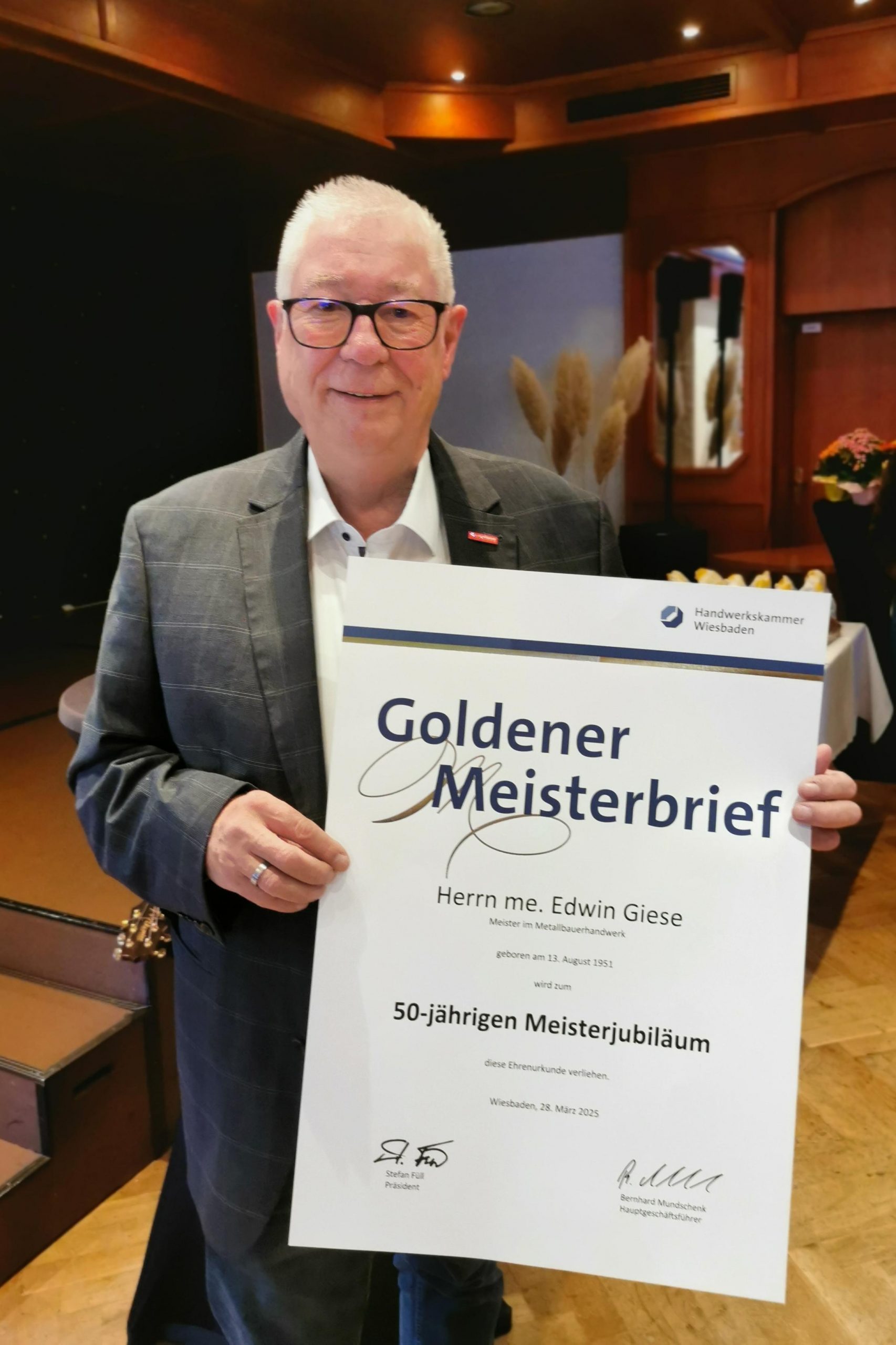 Kreishandwerksmeister Edwin Giese eröffnete den Nachmittag mit einer kurzen Begrüßung und freute sich über die große Resonanz. Eine besondere Überraschung gab es für ihn selbst: Er erhielt den Goldenen Meisterbrief für 50 Jahre Meisterprüfung im Metallbauer-Handwerk, der ihm von Vorstandsmitglied Verena Diehl überreicht wurde.