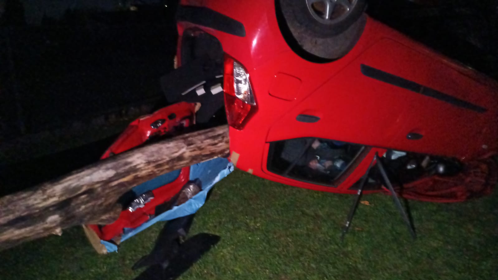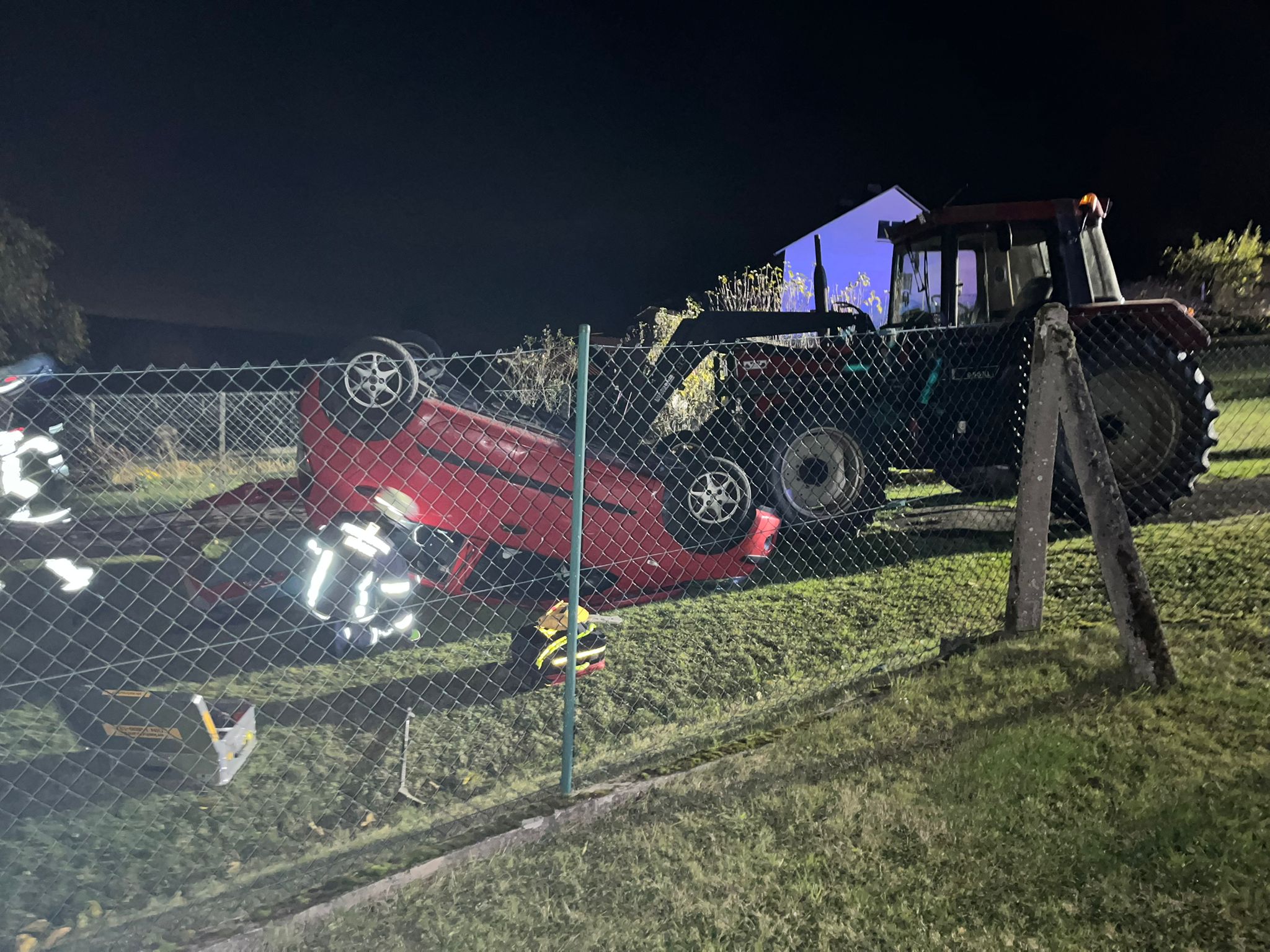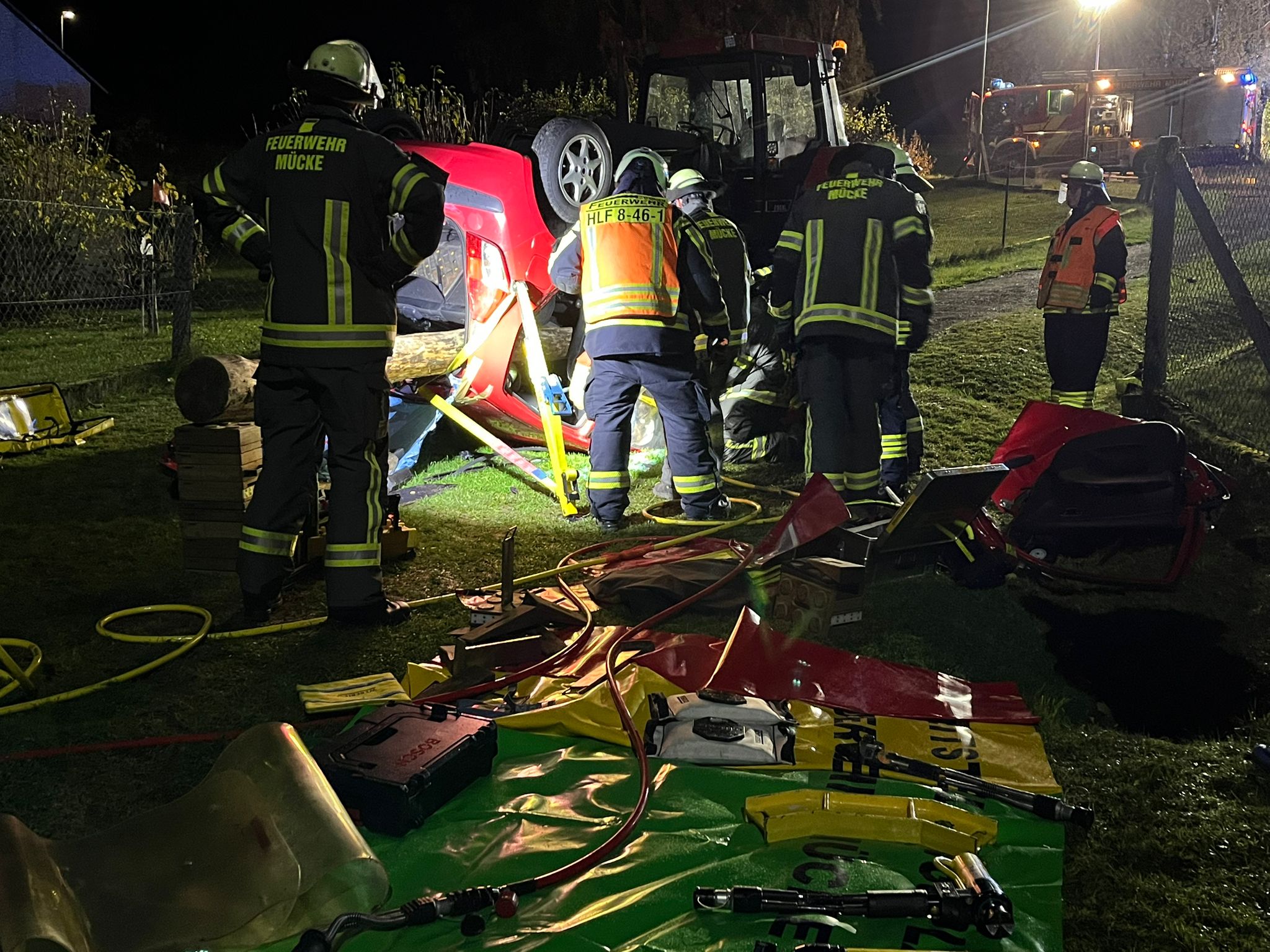 Am Unfallort erfolgte eine aufwändige technische Rettung unter der Leitung von Abschnittsleiter Jörg Schneider. Zeitgleich bekämpfte die Feuerwehr aus Wettsaasen den Flächenbrand. Wehrführer Ulrich Kratz ließ gezielt vorgehen, um den Brand rasch unter Kontrolle zu bringen. Das DRK Mücke war mit einem Krankentransportwagen (KTW) vor Ort, für den Einsatz zeichnete Stefanie Schulz verantwortlich.