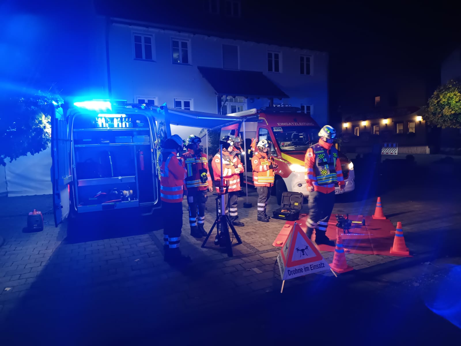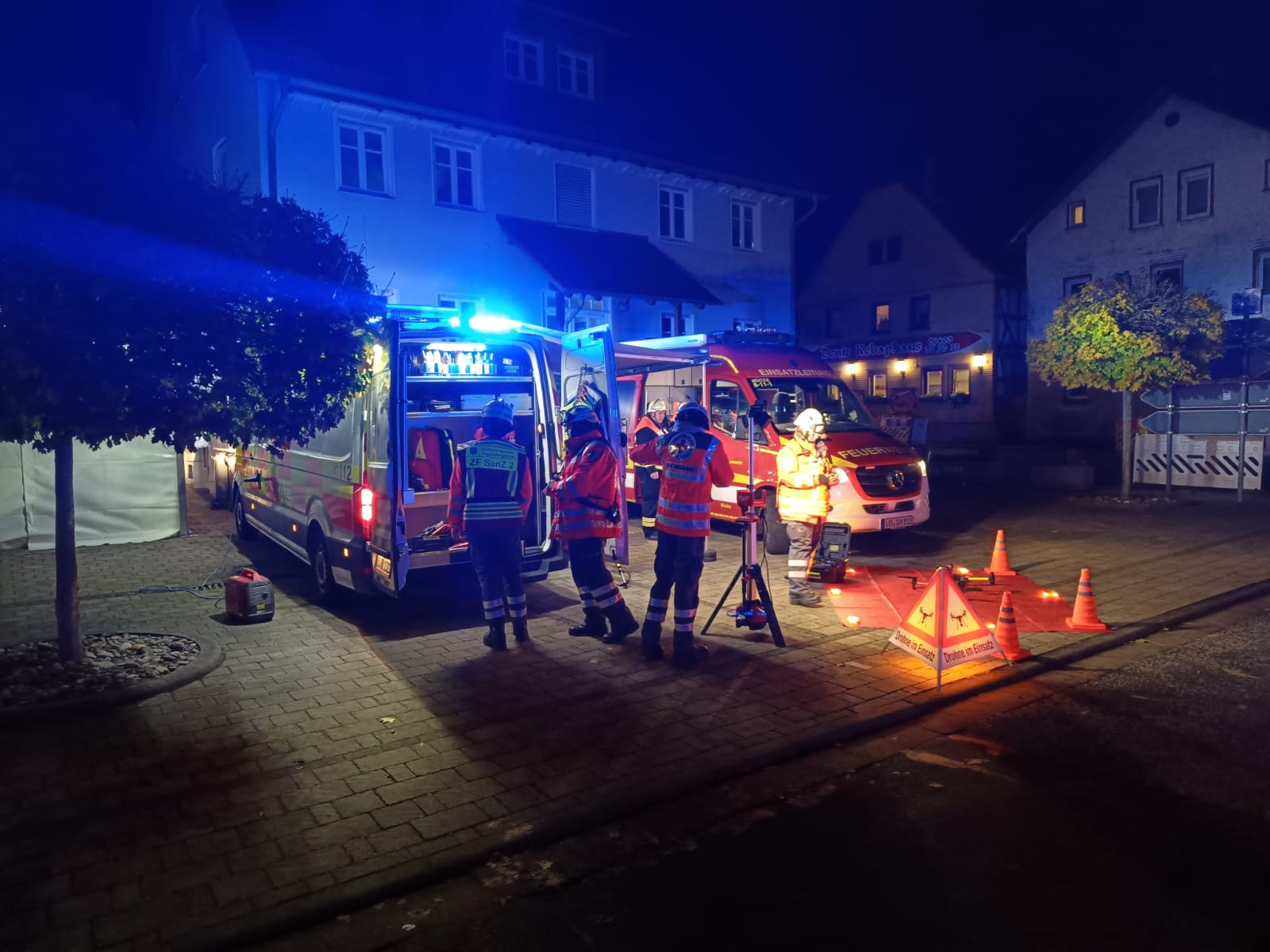 Am Rathaus wurde eine Einsatzleitung eingerichtet, Michala Wissner kordierte hier alle Einsatzkräfte. Die Einsatzdrohne des DRK Mücke wurde hier auch in Stellung gebracht. „Unsere Einsatzdrohne hat uns geholfen, den Überblick über alle Einsatzabschnitte zu behalten“, erklärte Julia Myska vom DRK Mücke. „So konnten wir der Einsatzleitung jederzeit aktuelle Informationen liefern.“