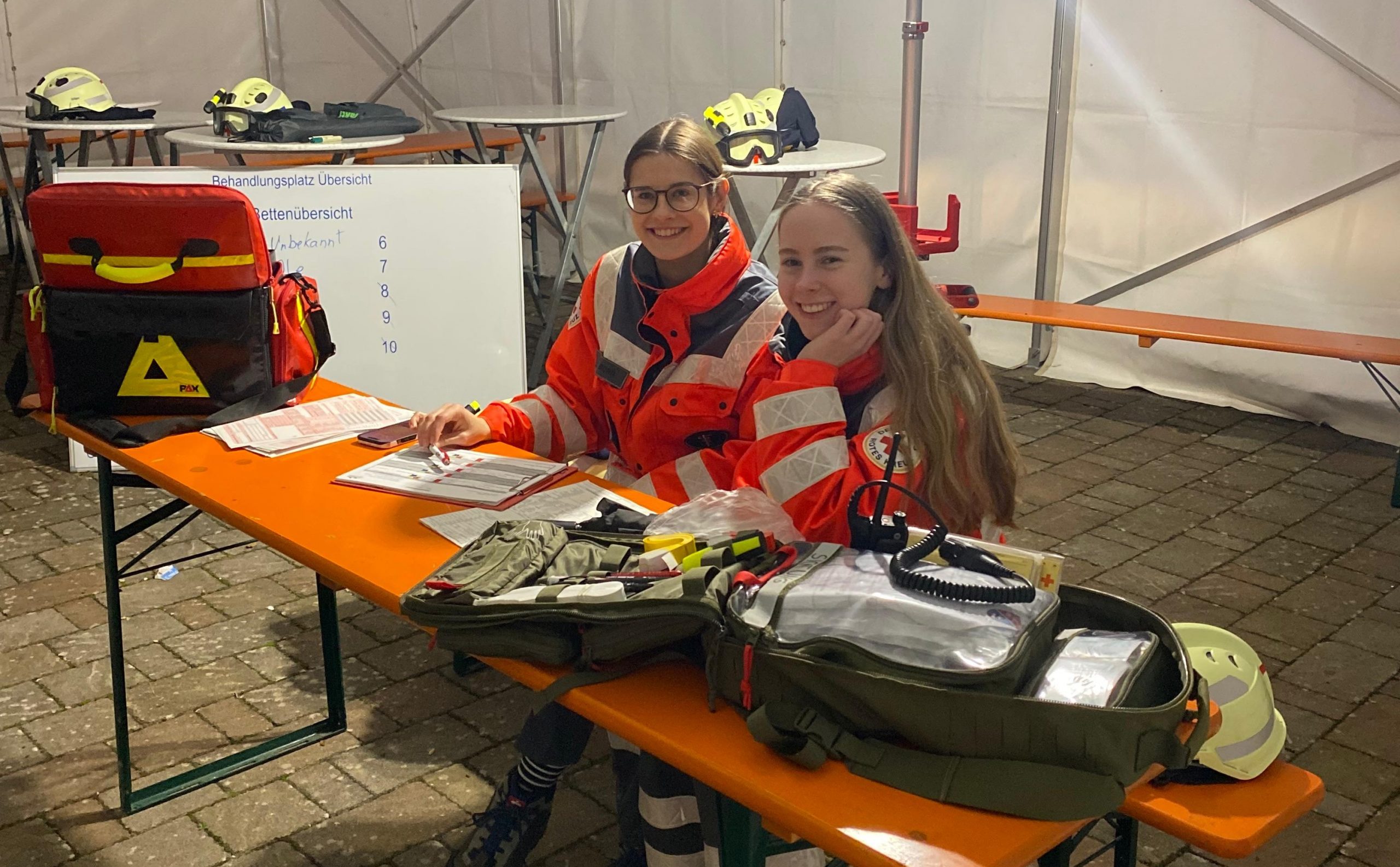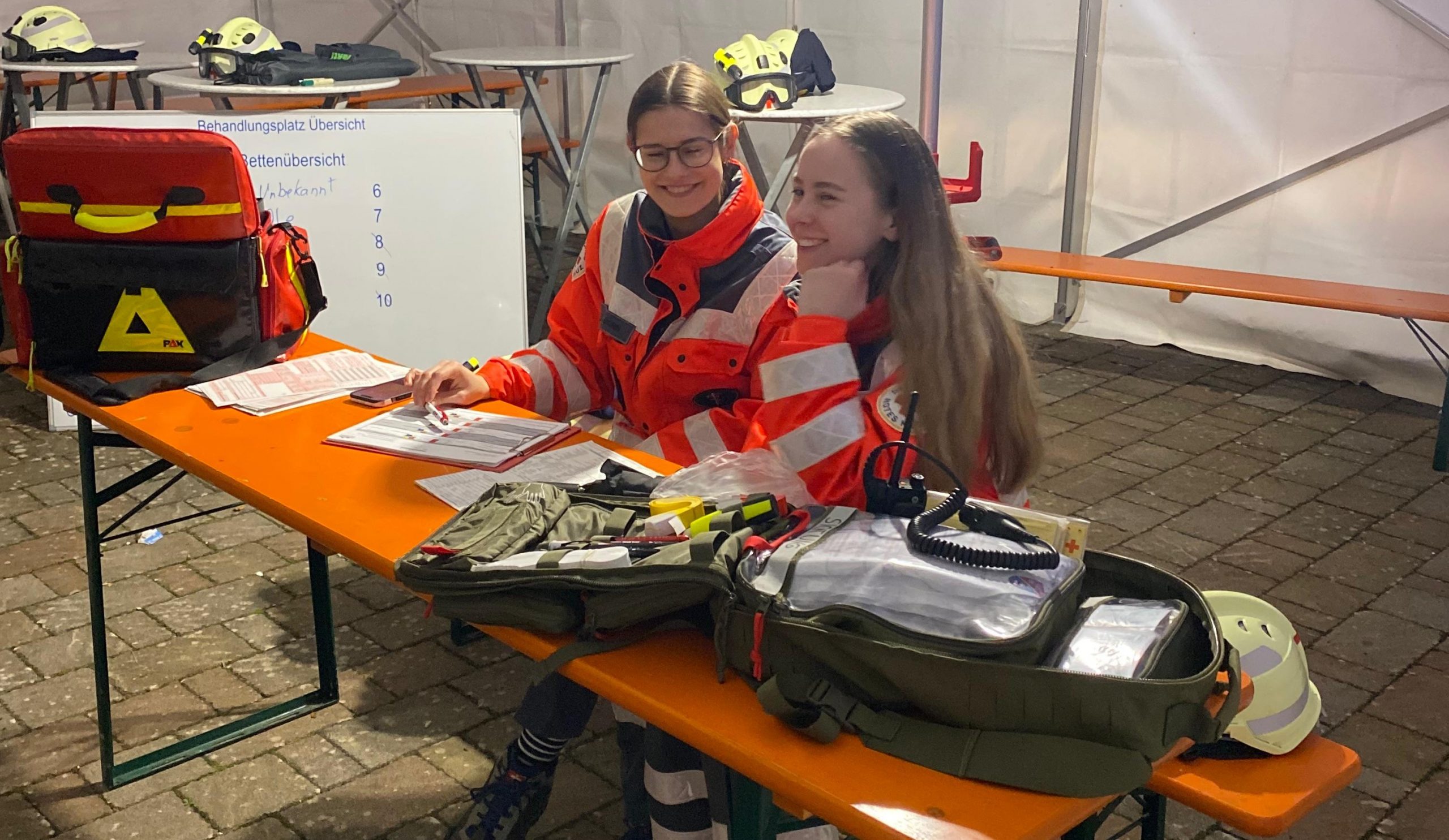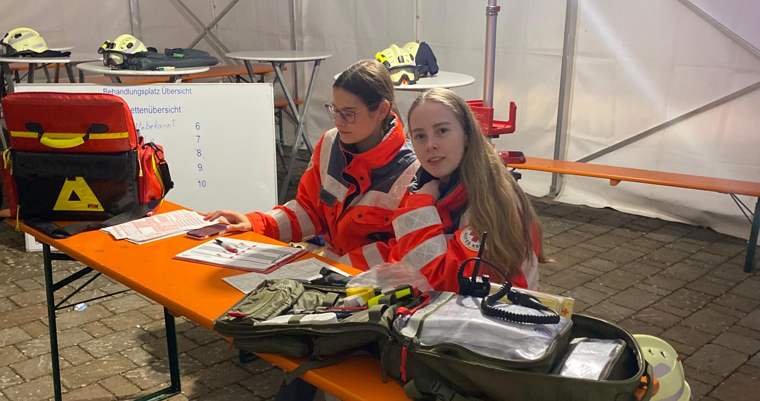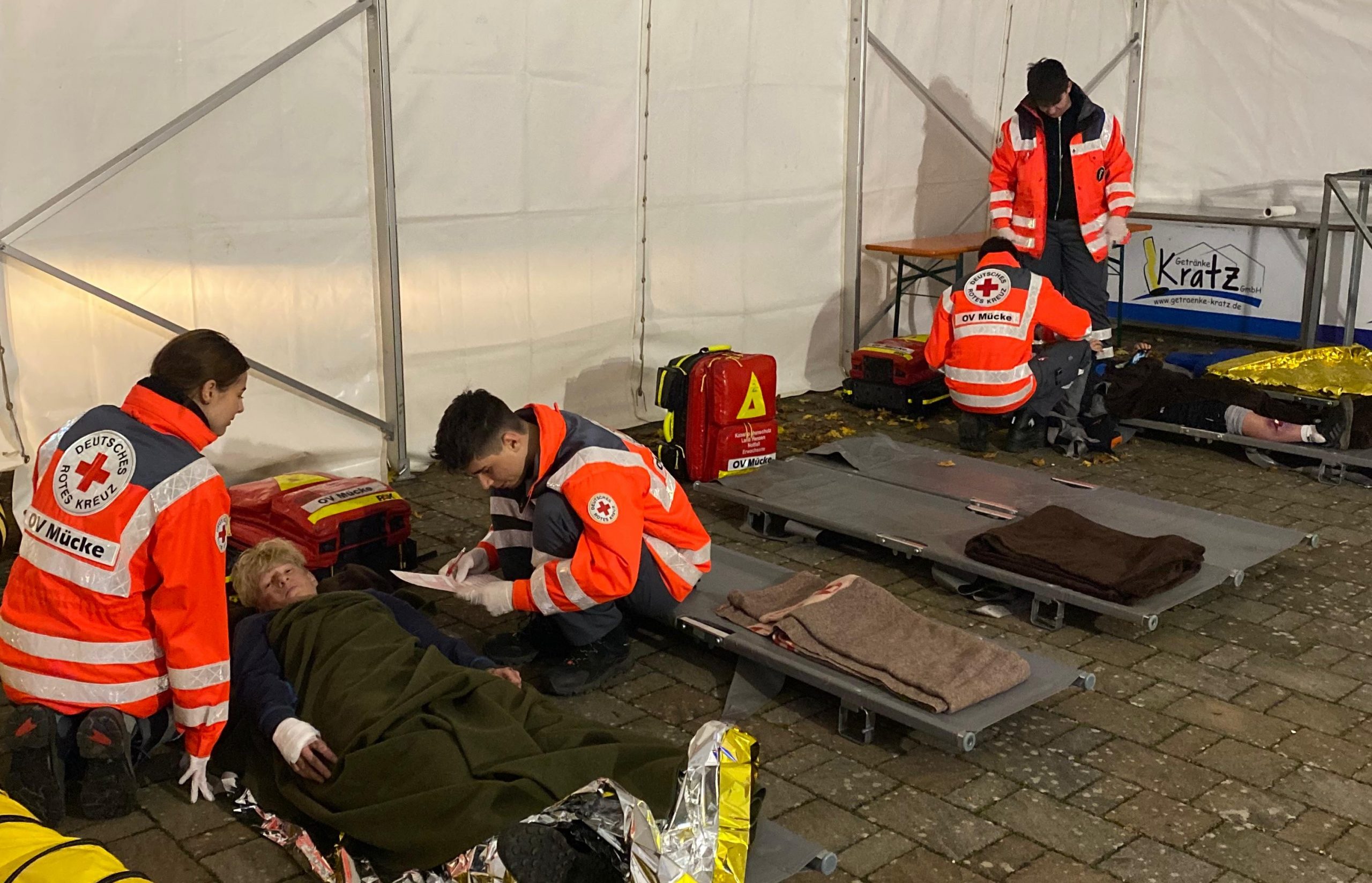 Insgesamt mussten acht verletzte Personen versorgt werden. Nach der Rettung wurden sie von Jannik Büttner und seinem Team am Behandlungsplatz betreut. Neben der Behandlung der Patienten wurden die Verletzungsmuster sowie Daten der Patienten erfasst, um diese beim Krankenhaus anzumelden.