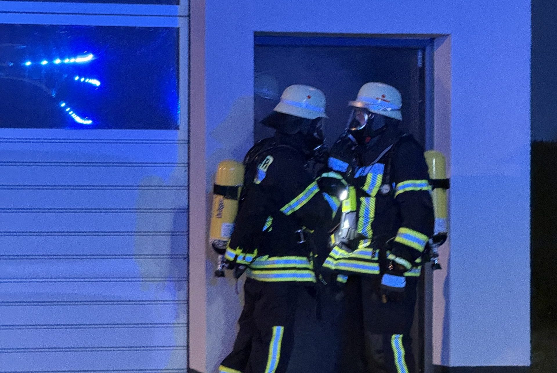 Kurz darauf stand fest, dass sich noch zwei Personen in der verrauchten Halle befanden. Angriffstrupps beider Wehren drangen unter schwerem Atemschutz zur Menschenrettung in das Gebäude vor. Im Verlauf der Übung stellte sich heraus, dass eine der Personen verletzt aus der Halle geflüchtet war und in unmittelbarer Umgebung gestürzt war. Die Einsatzkräfte mussten die verletzte Person zunächst auffinden und erstversorgen, bevor sie an den fiktiven Rettungsdienst übergeben wurde.
