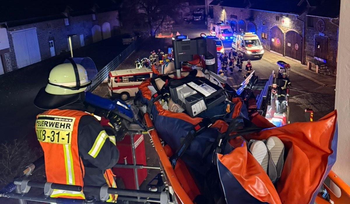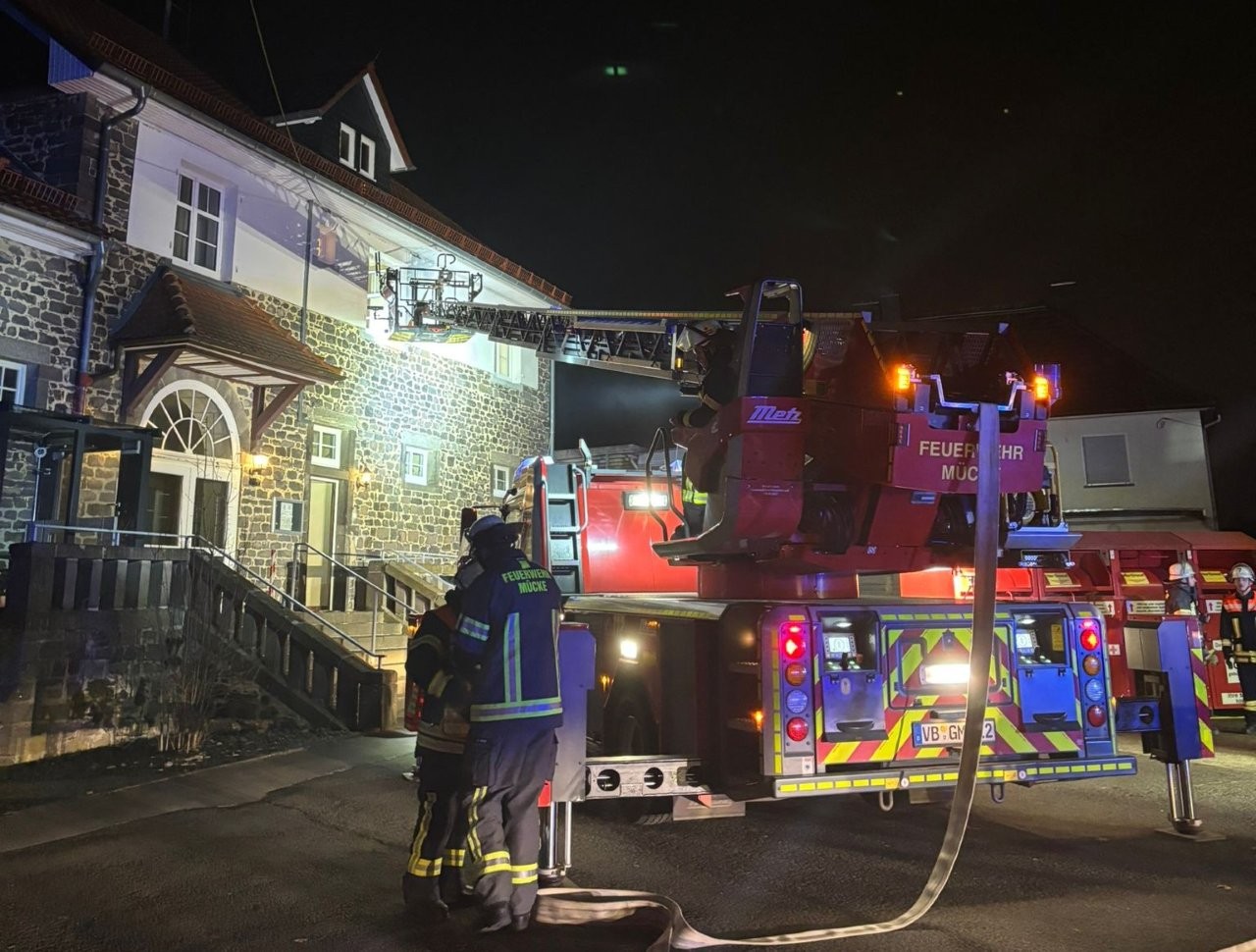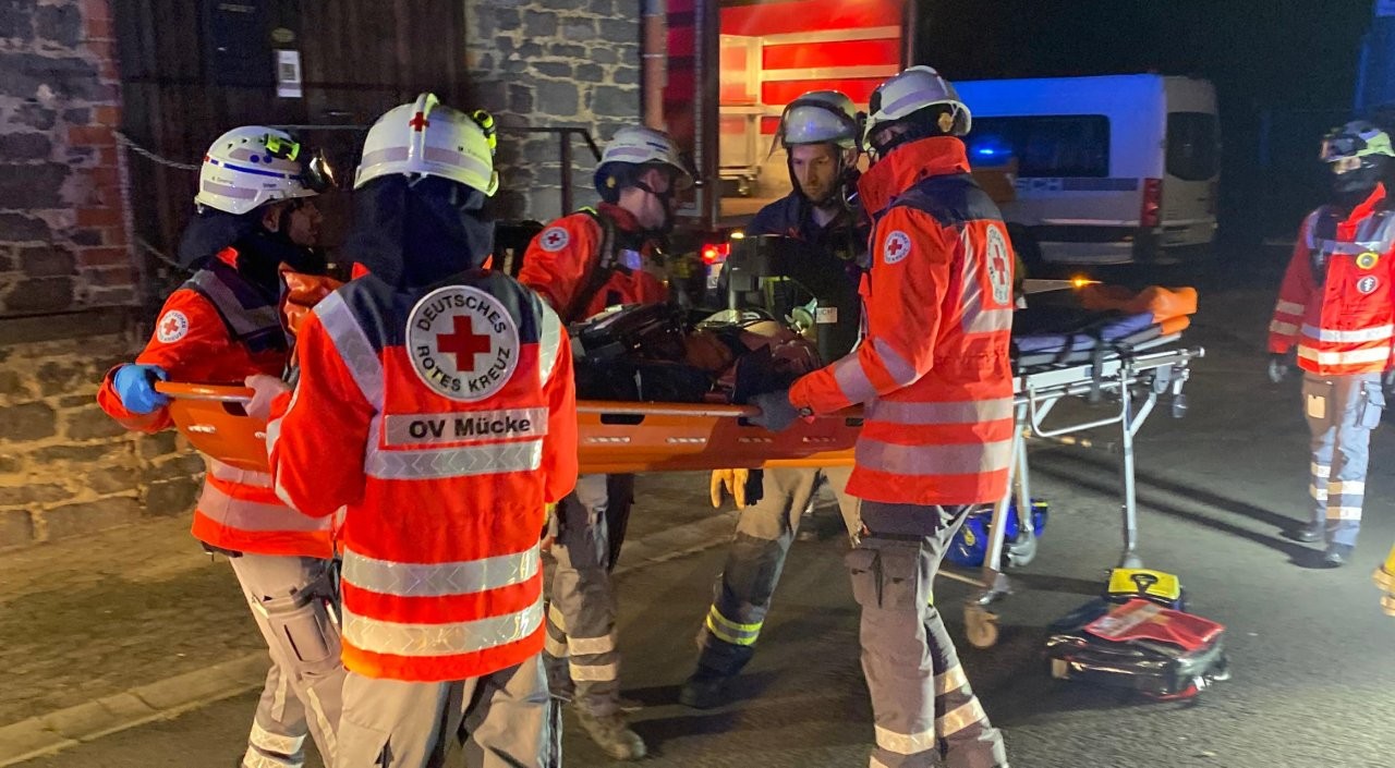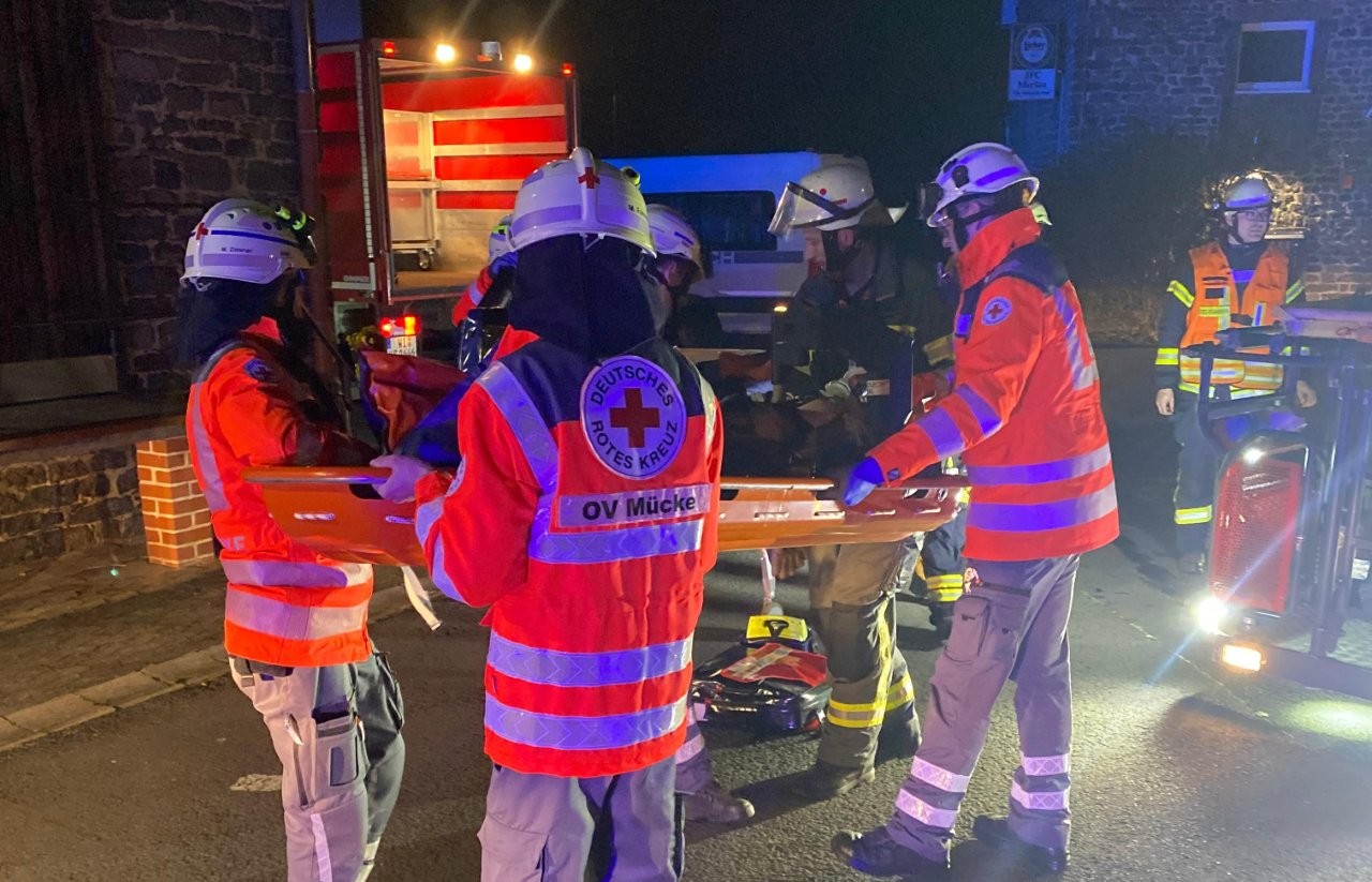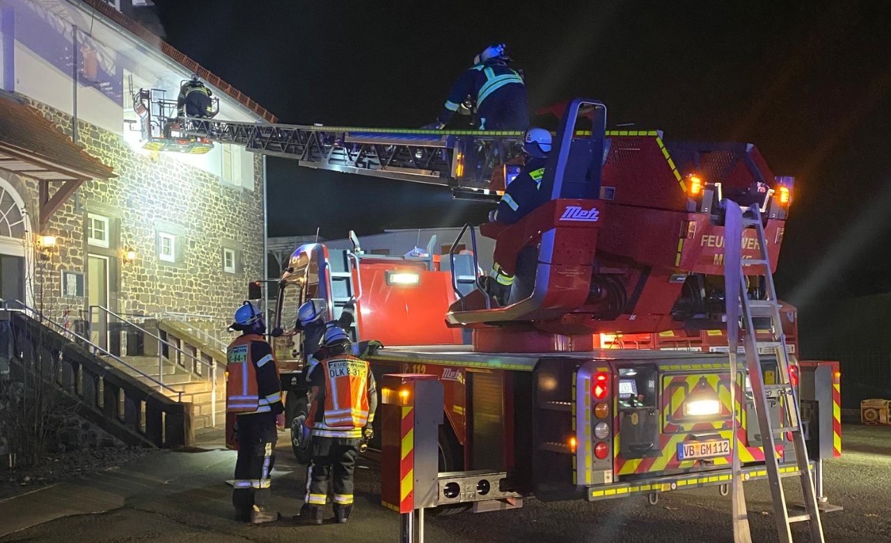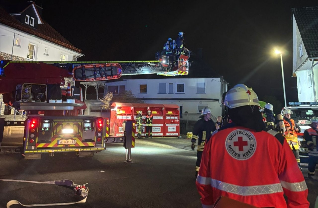 Kurz darauf trafen auch die Einsatzkräfte des DRK Mücke unter Bereitschaftsleiter Marius Zimmer sowie die Unterstützung des DRK Alsfeld ein. Zeitgleich rückte die Drehleiter aus Nieder-Ohmen an und wurde vor dem DGH unter der Leitung von Fahrzeugführer Janne Hof in Stellung gebracht. Über den Leiterpark gelangten die Feuerwehrleute schließlich zur Menschenrettung ins Gebäude.