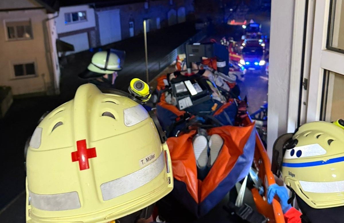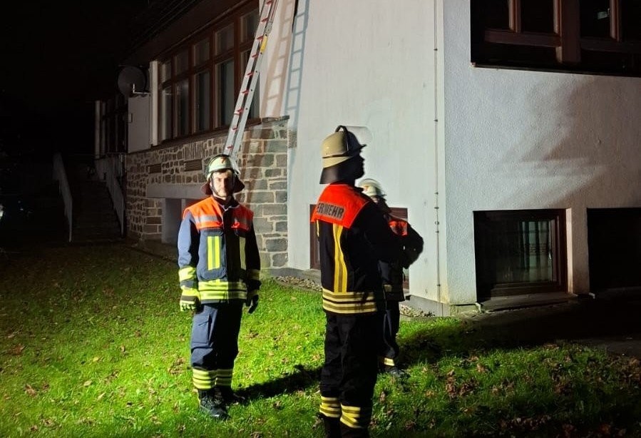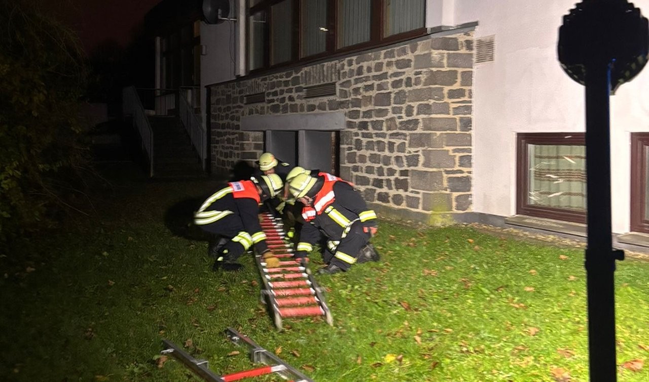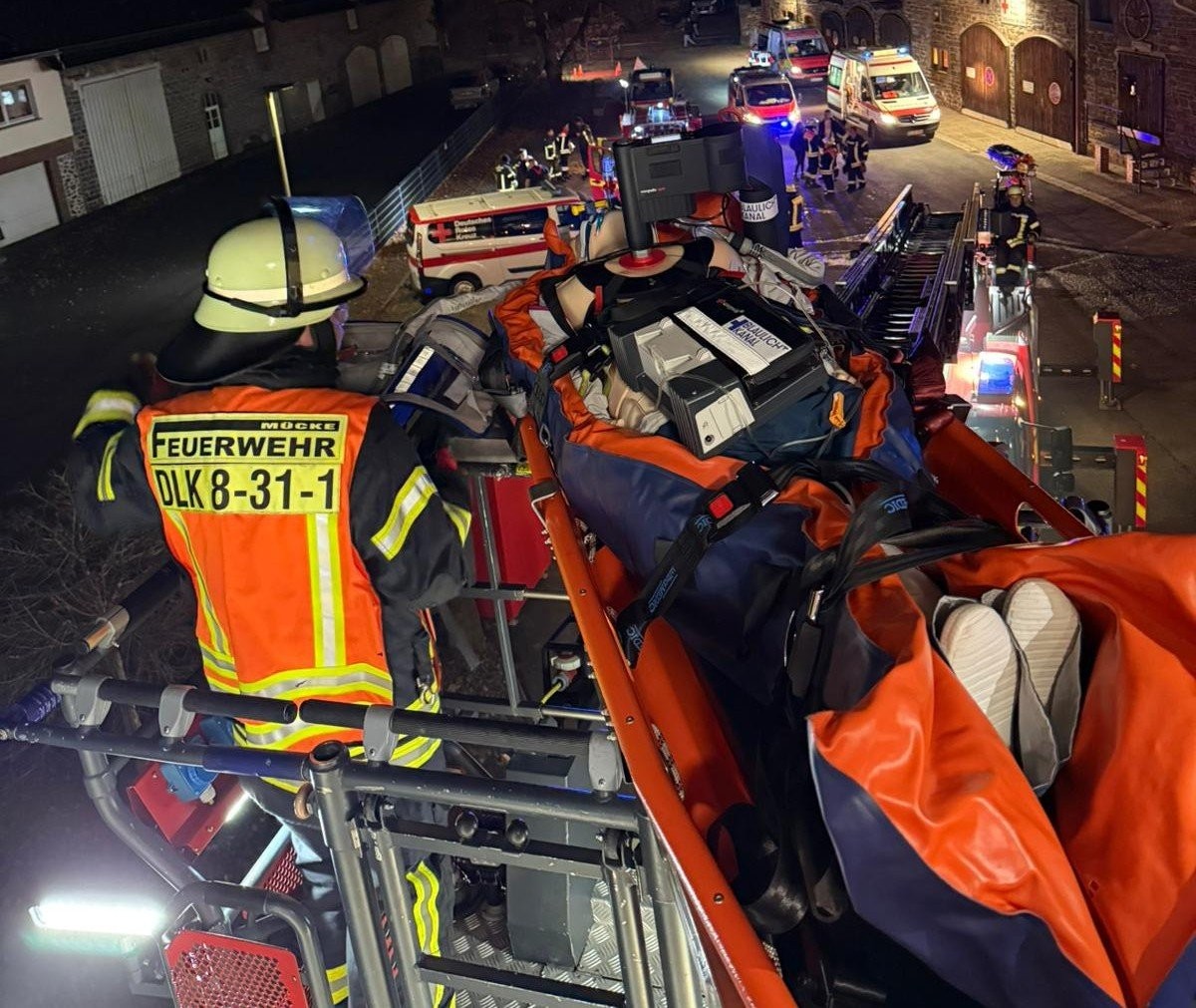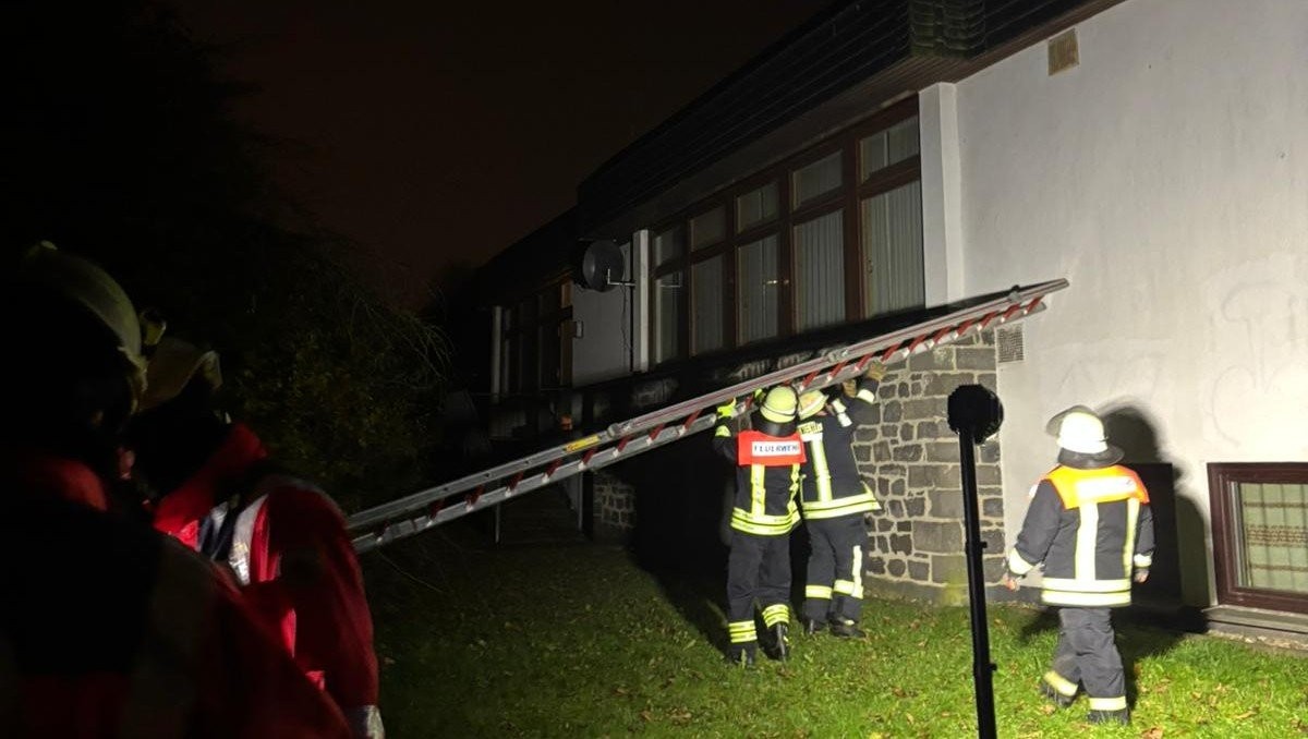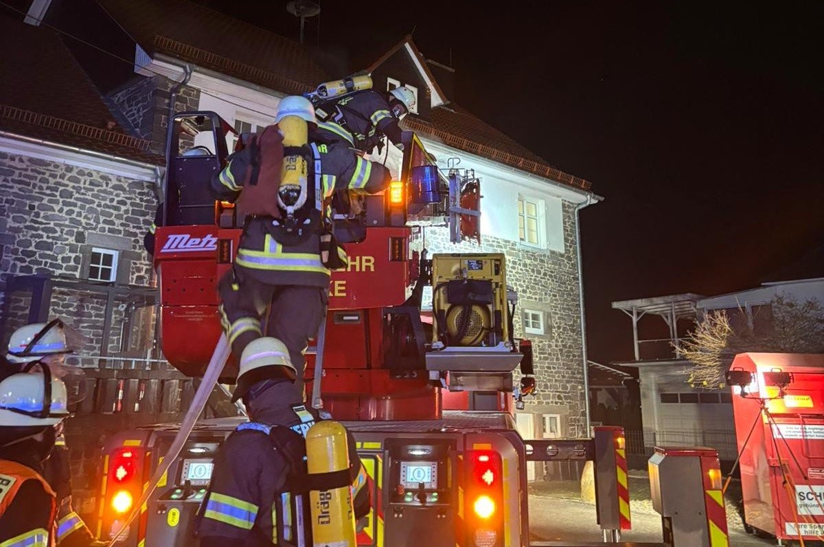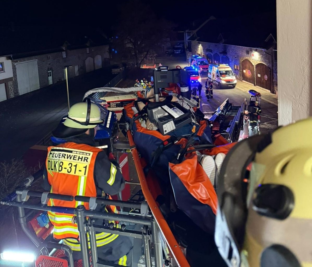 Kurz darauf trafen auch die Einsatzkräfte des DRK Mücke unter Bereitschaftsleiter Marius Zimmer sowie die Unterstützung des DRK Alsfeld ein. Zeitgleich rückte die Drehleiter aus Nieder-Ohmen an und wurde vor dem DGH unter der Leitung von Fahrzeugführer Janne Hof in Stellung gebracht. Über den Leiterpark gelangten die Feuerwehrleute schließlich zur Menschenrettung ins Gebäude.