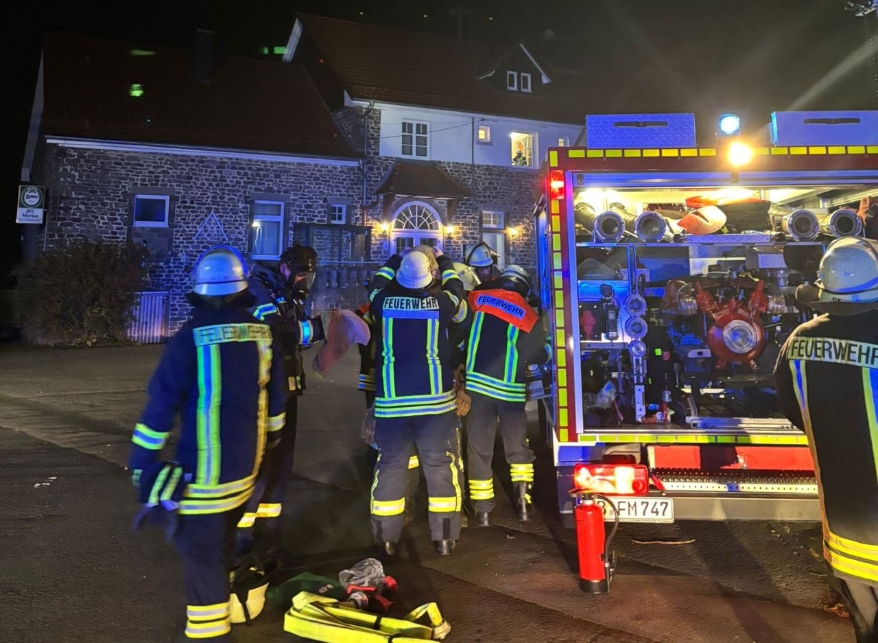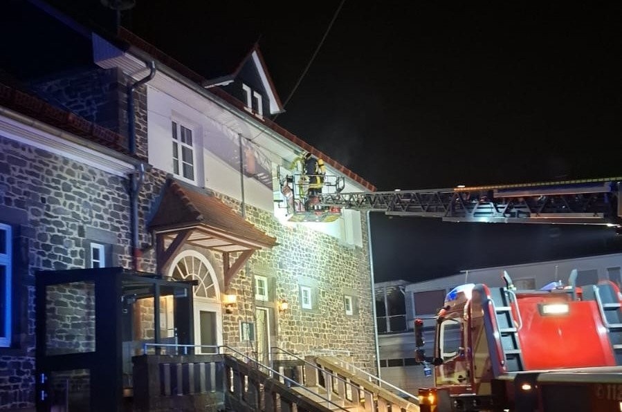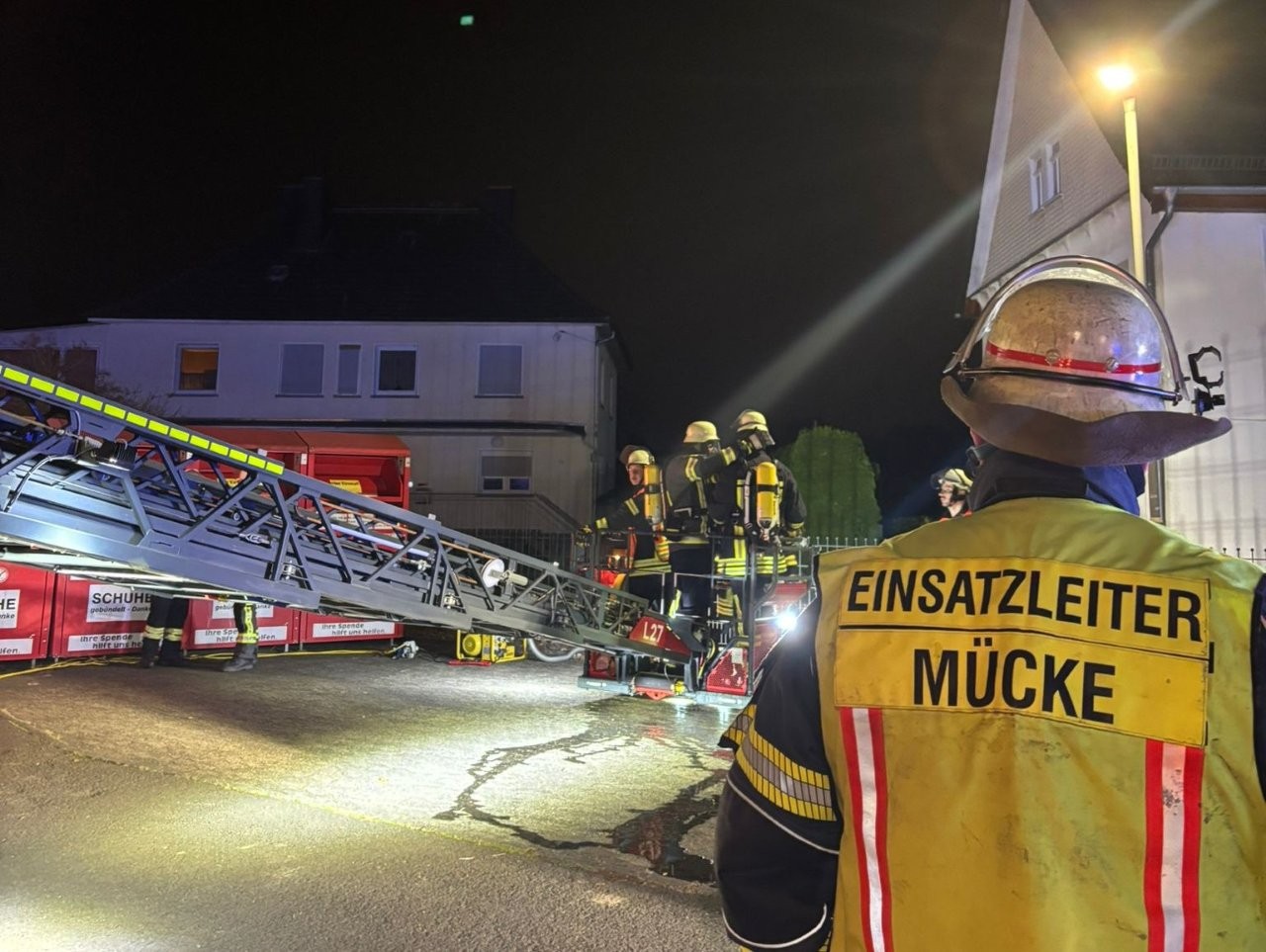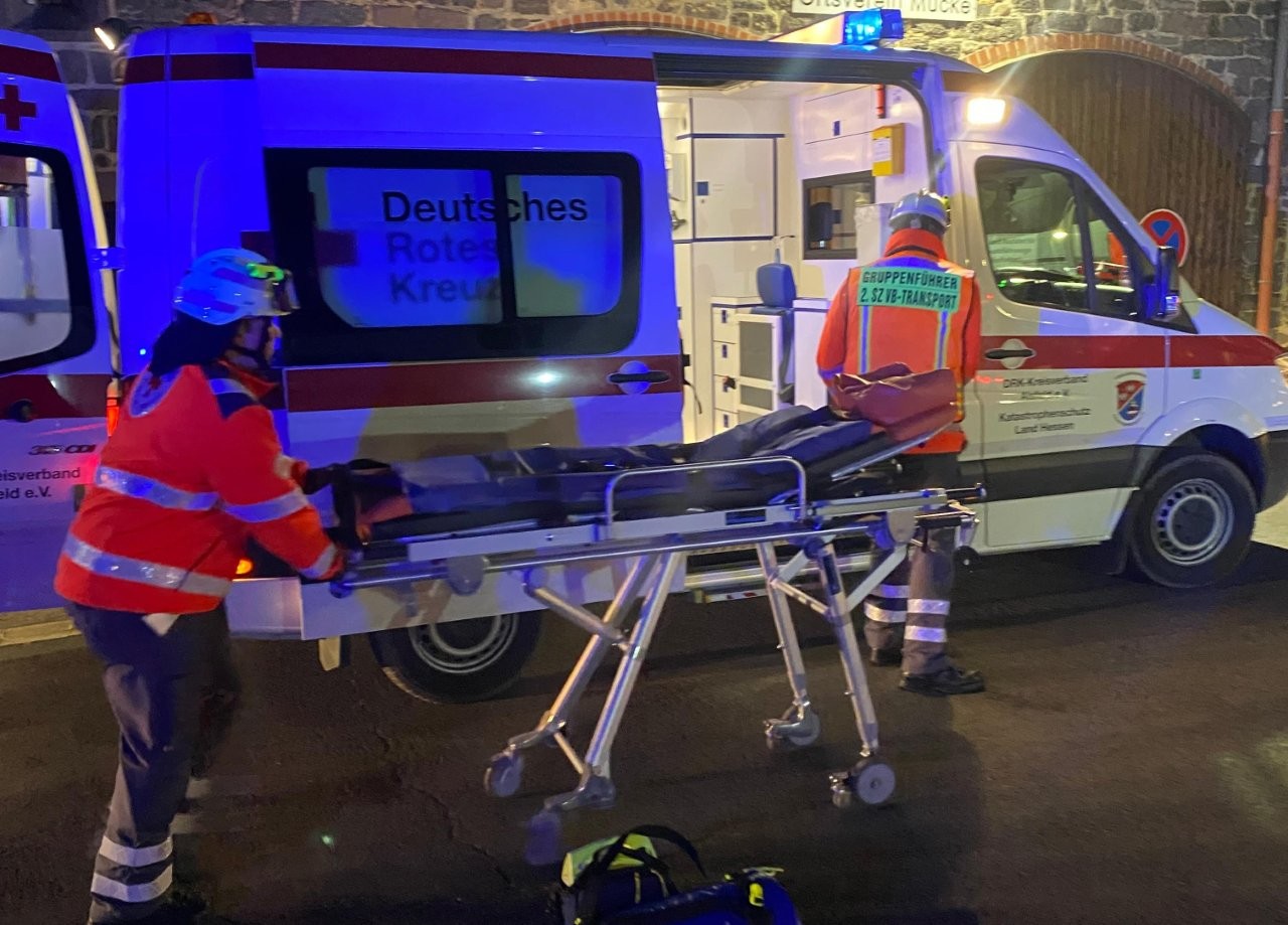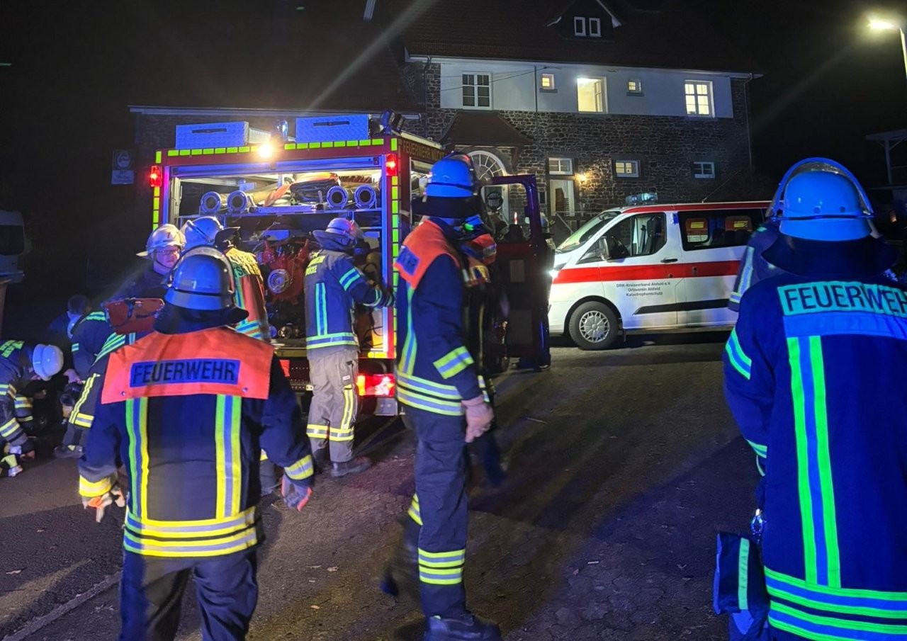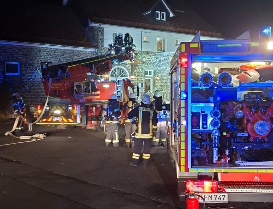 Kurz darauf trafen auch die Einsatzkräfte des DRK Mücke unter Bereitschaftsleiter Marius Zimmer sowie die Unterstützung des DRK Alsfeld ein. Zeitgleich rückte die Drehleiter aus Nieder-Ohmen an und wurde vor dem DGH unter der Leitung von Fahrzeugführer Janne Hof in Stellung gebracht. Über den Leiterpark gelangten die Feuerwehrleute schließlich zur Menschenrettung ins Gebäude.