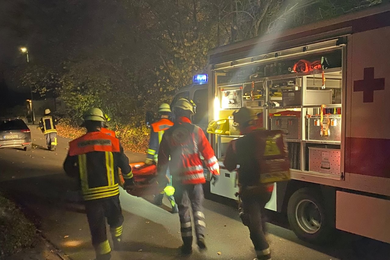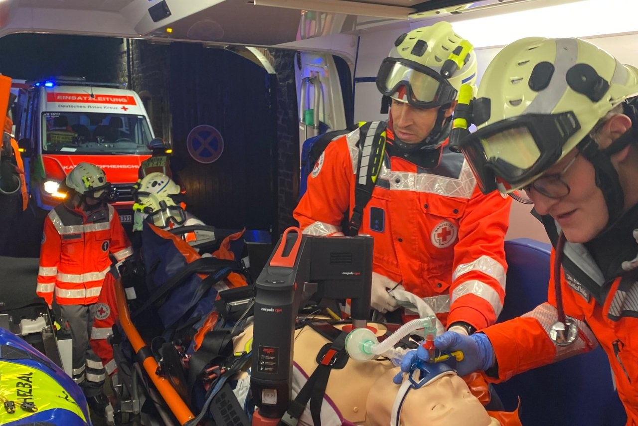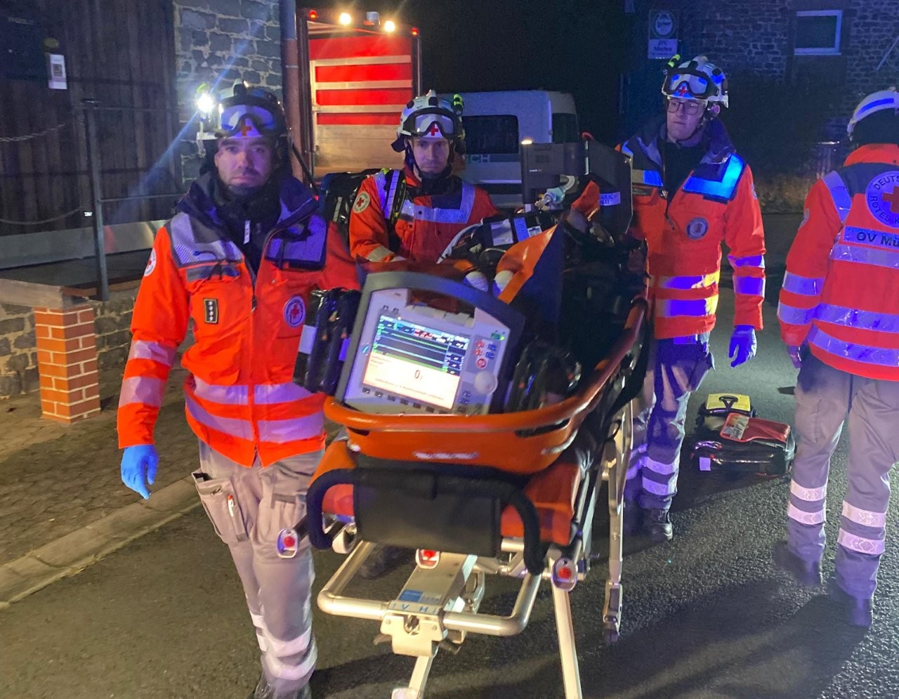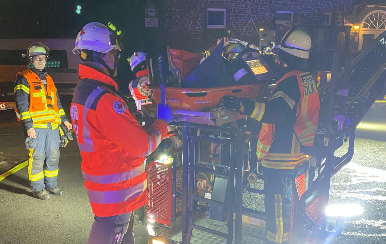 Feuerwehr und DRK stellten anschließend einen kombinierten Suchtrupp zusammen, der mithilfe der Drohne die vermisste Person schnell lokalisieren und retten konnte. Eine verletzte Person wurde über die Drehleiter ins Freie gebracht und durch das Rote Kreuz medizinisch versorgt.