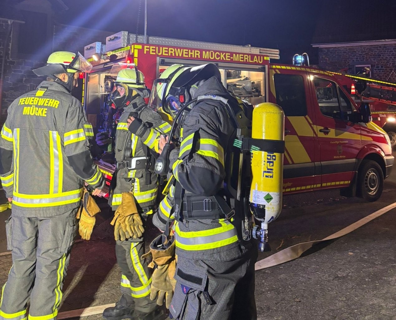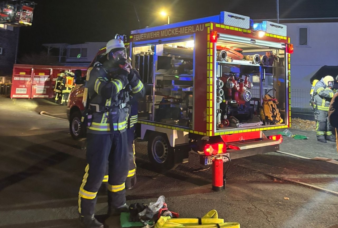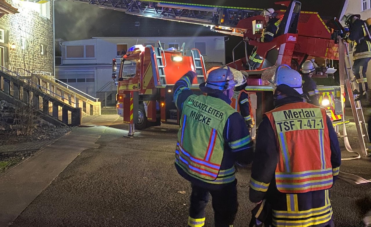 MERLAU (ol). Ein Feuer im Dorfgemeinschaftshaus Merlau war das Szenario einer groß angelegten Einsatzübung der Freiwilligen Feuerwehr Mücke-Merlau und der DRK-Bereitschaft Mücke. Gemeinsam mit dem DRK Alsfeld und der Drehleiter aus Nieder-Ohmen probten die Einsatzkräfte am Freitagabend ein komplexes Rettungsszenario mit mehreren vermissten Personen.