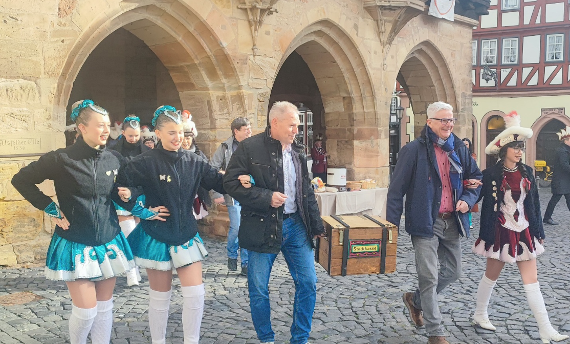 Mit Trommeln, Gesang und guter Laune zogen die Karnevalisten vor das Rathaus und forderten Bürgermeister Stephan Paule lautstark dazu auf, die Macht abzugeben. Von oben blickten Bürgermeister und Stadträte aus den Fenstern hinab auf die bunte Narrenschar – nicht ohne eine kleine Stichelei: „Manche meinen wir hätten nichts zu tun – doch haben wir keine Zeit, uns auszuruhn!“